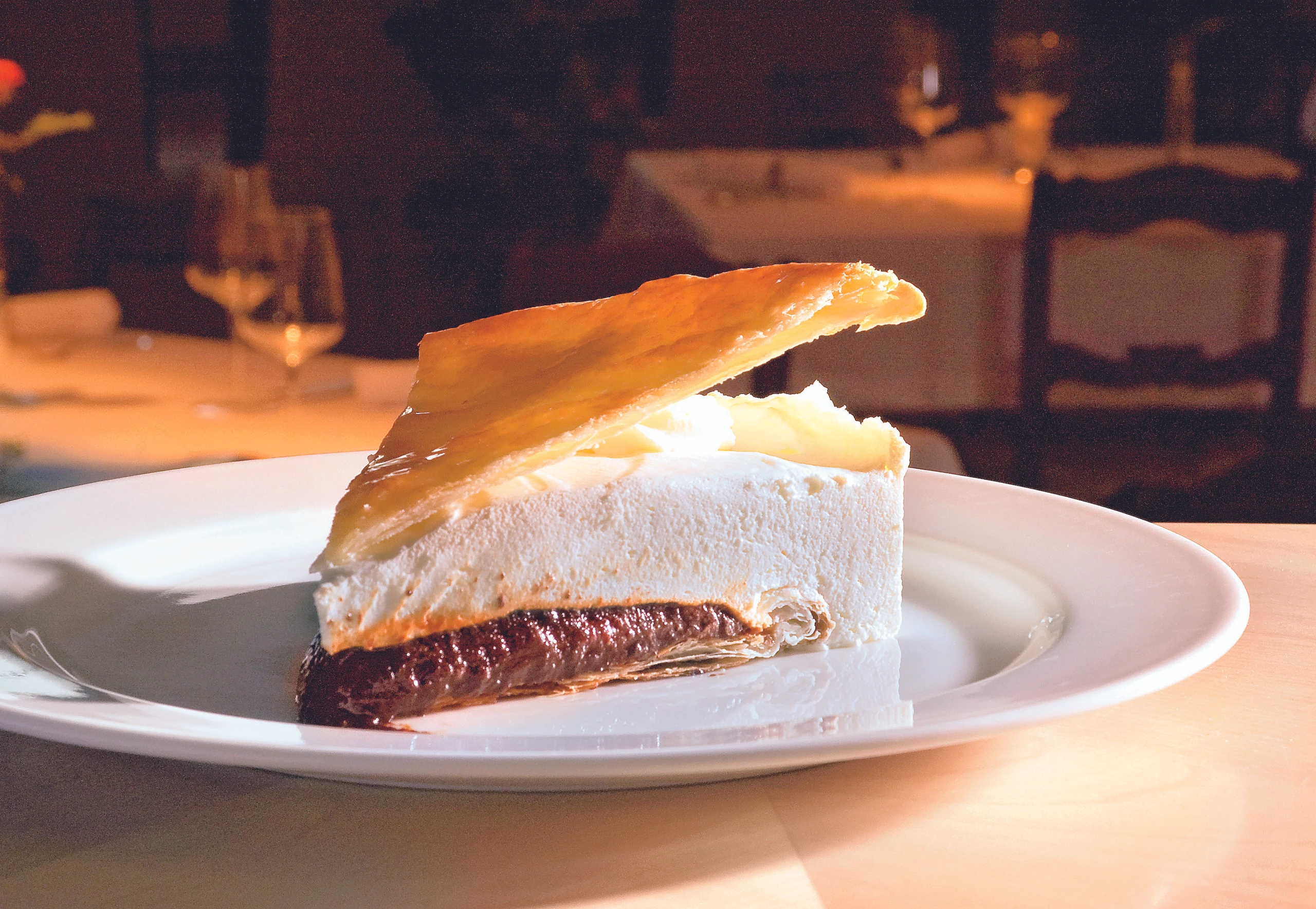 Glasur: Zucker mit Wasser aufkochen, auf den zweiten Teigboden streichen und fest werden lassen (ca. 1 Stunde). Torte aus der Form lösen. Die glasierte Teigplatte in 12 Stücke teilen und auf die Torte legen. Torte in Stücke schneiden.