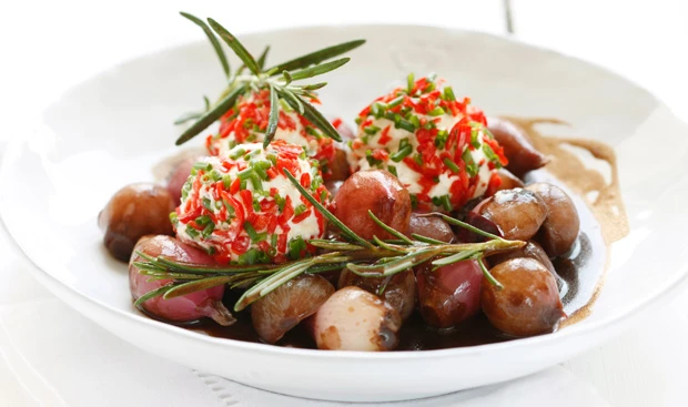 - Für die Käsebällchen Peperoncini und Schnittlauch möglichst klein schneiden. Frischkäse, Topfen und Pecorino gut verrühren, mit Salz und Pfeffer würzen. Aus der Masse mit befeuchteten Händen 12 Bällchen formen, in Peperoncini und Schnittlauch wälzen. Käsebällchen mit Schalotten anrichten und mit Rosmarin garniert servieren.