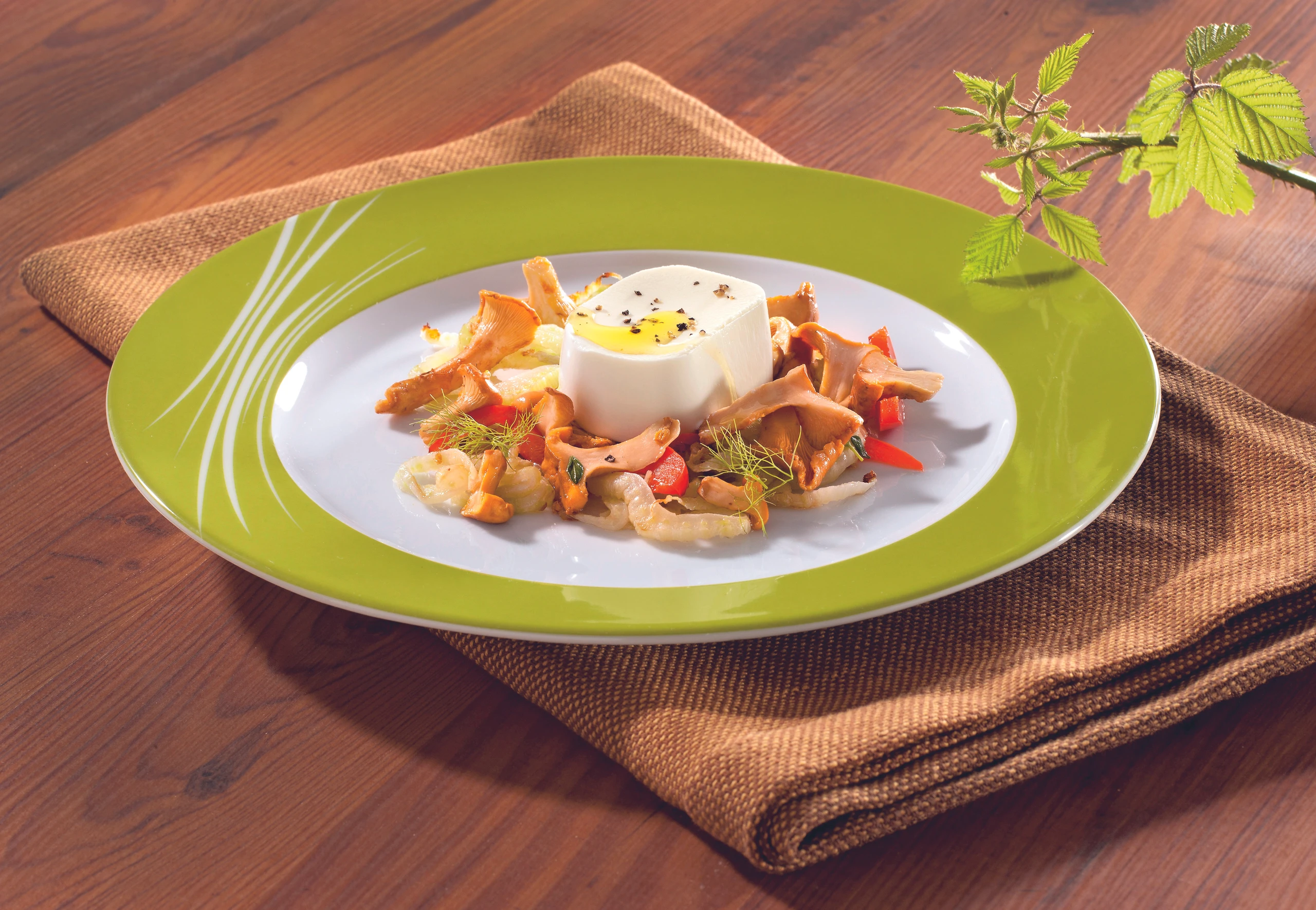 - Frischkäse in 4 Stücke schneiden und mit dem Fenchel-Eierschwammerl-Gemüse auf Tellern anrichten. Mit Olivenöl beträufeln, salzen und pfeffern.