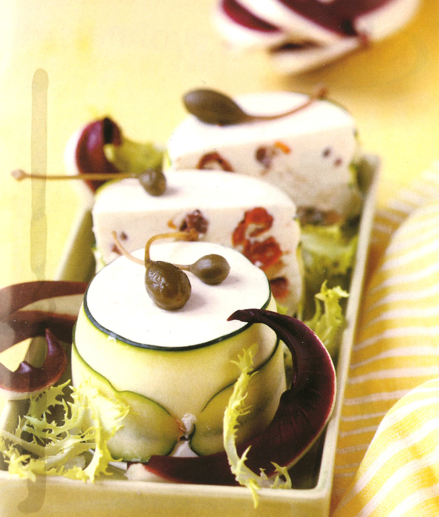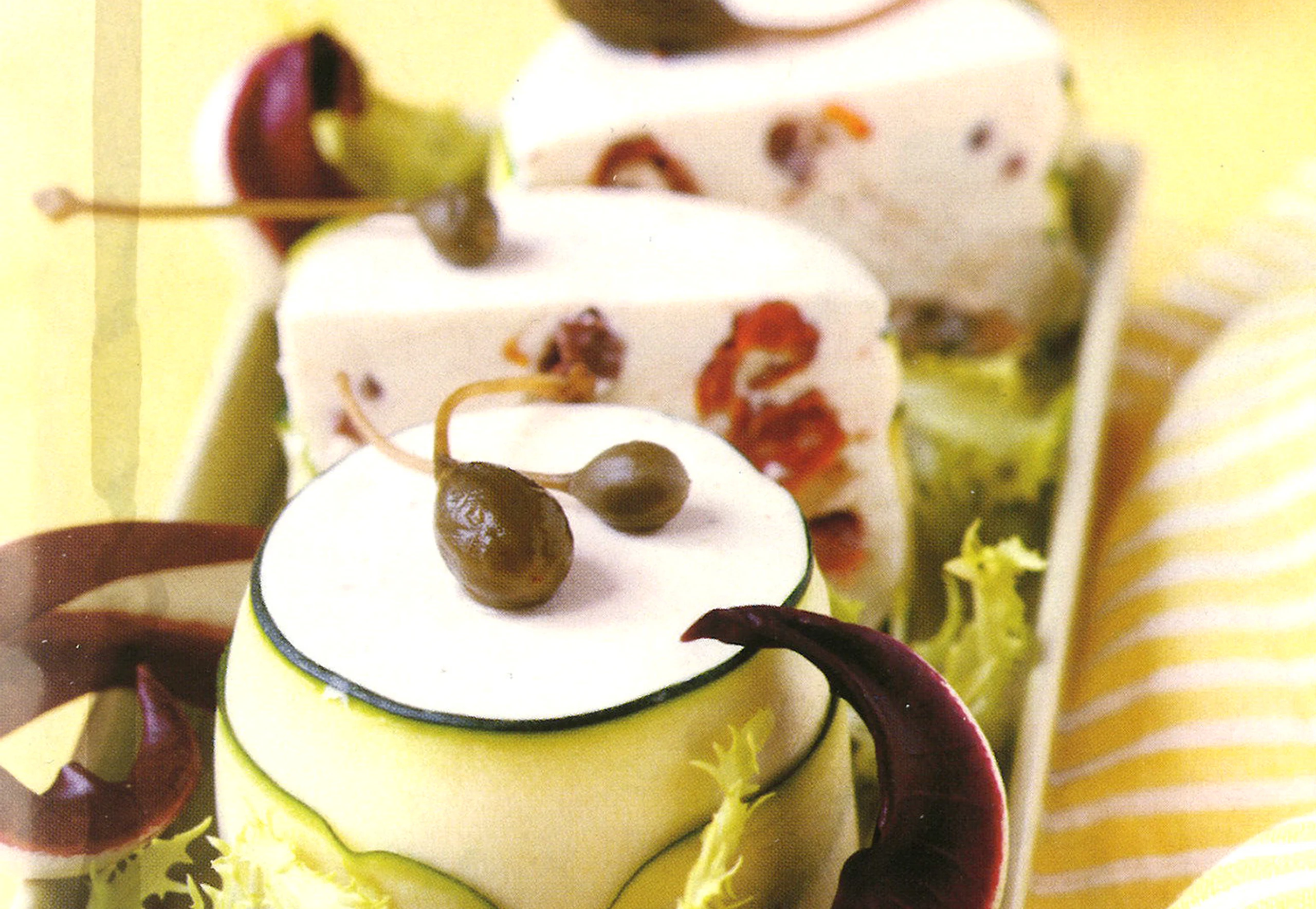 Salate zerpflücken. Förmchen kurz in heißes Wasser tauchen, Törtchen auf Teller stürzen und mit Salaten und Kapern garnieren.