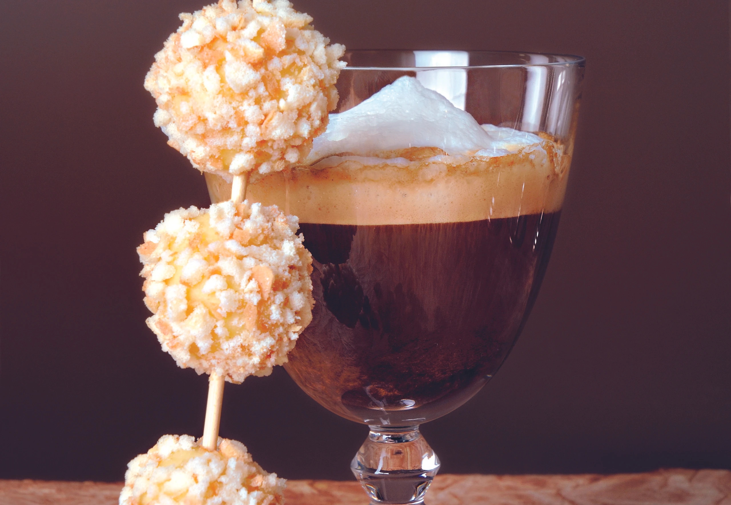 - Knödel aus dem Wasser nehmen, abtropfen lassen und in den Biskottenbröseln wenden. Milch aufschäumen. Espressi in Gläsern mit Milchschaum anrichten, Knödel auf Holzspieße stecken und mit der Melange servieren.