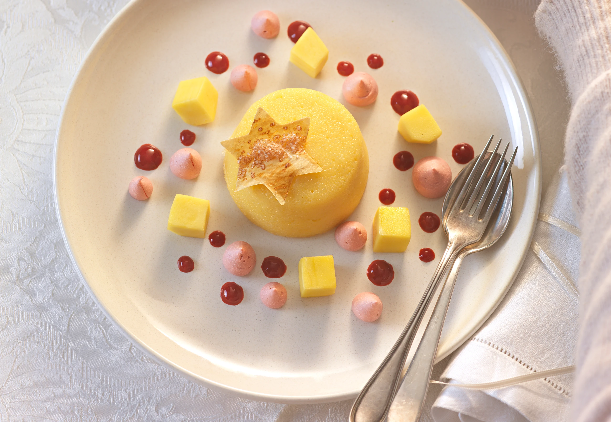 - Puddings mit Mango, Sauce und Creme anrichten, mit Strudelsternen garniert servieren.