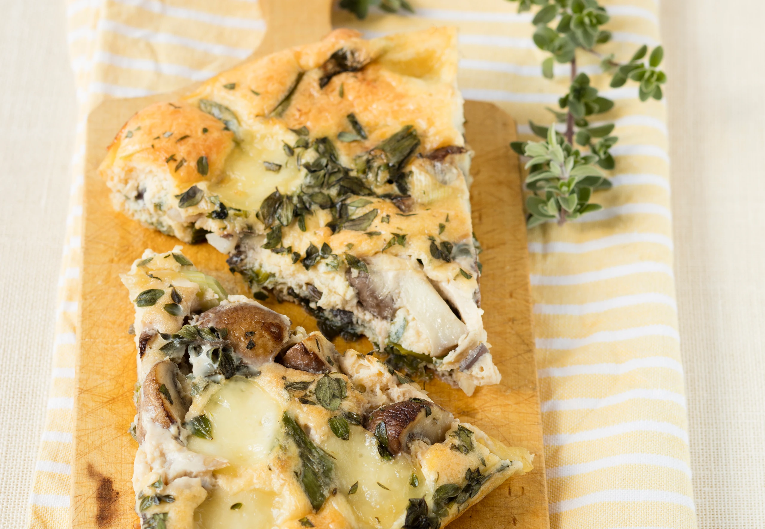 Rohr auf 200°C vorheizen. Eier mit Bergkäse und Majoran verquirlen, mit Salz und Pfeffer würzen. Zwiebeln und Knoblauch schälen. Zwiebeln in Scheiben schneiden, Knoblauch hacken. Lauch längs halbieren, waschen und quer in 2 cm breite Stücke schneiden. Champignons sechsteln. Mozzarella abtropfen lassen und halbieren.