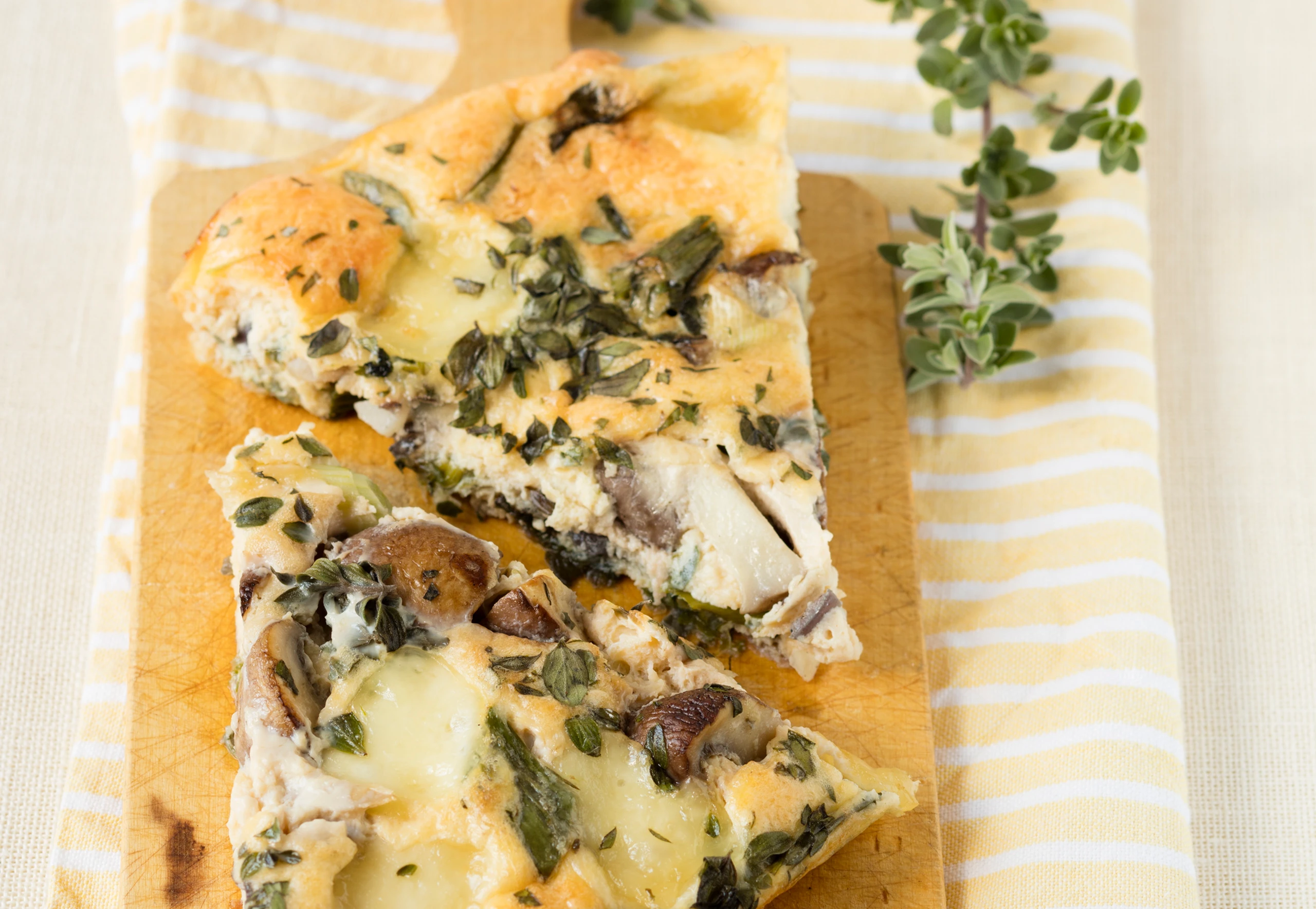 In einer Pfanne (Ø ca. 26 cm) 3 EL Leinöl erhitzen. Champignons, Zwiebeln, Lauch und Knoblauch scharf anbraten, mit Salz und Pfeffer würzen. Eimischung zugeben und ein wenig anbacken. Mozzarella in die Mischung drücken.