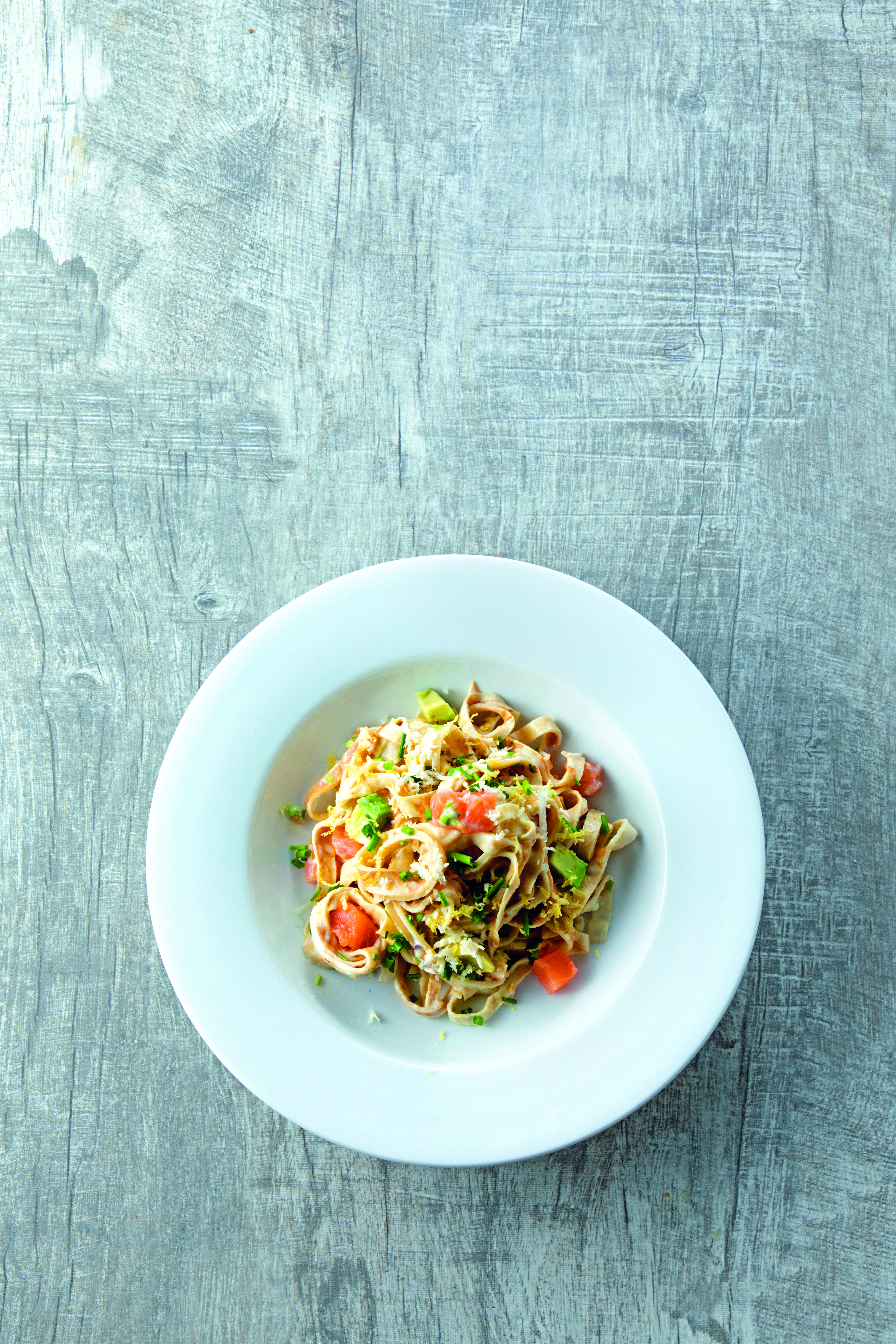 Lachs, Avocado und jeweils die Hälfte von Schnittlauch und Kren einrühren und kurz ziehen lassen. Palatschinken behutsam untermischen. Pasta anrichten und mit übrigem Schnittlauch und Kren bestreut servieren.