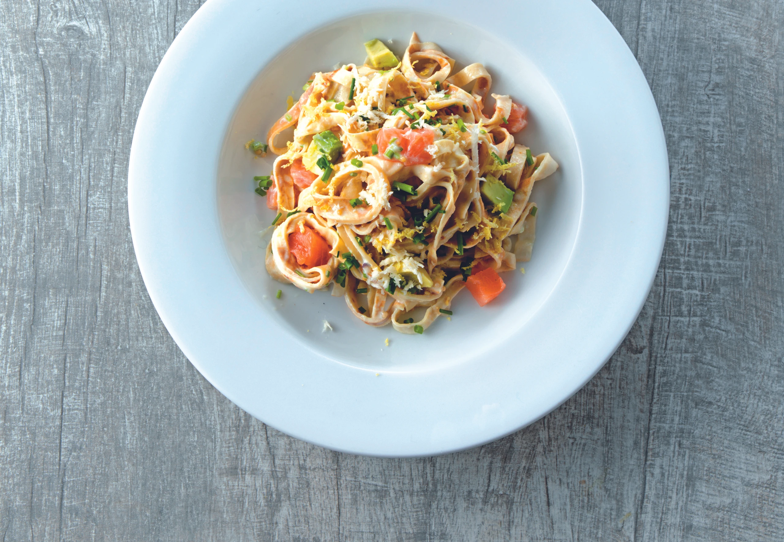 Frittatenpasta mit Räucherlachs, Avocado und Kren