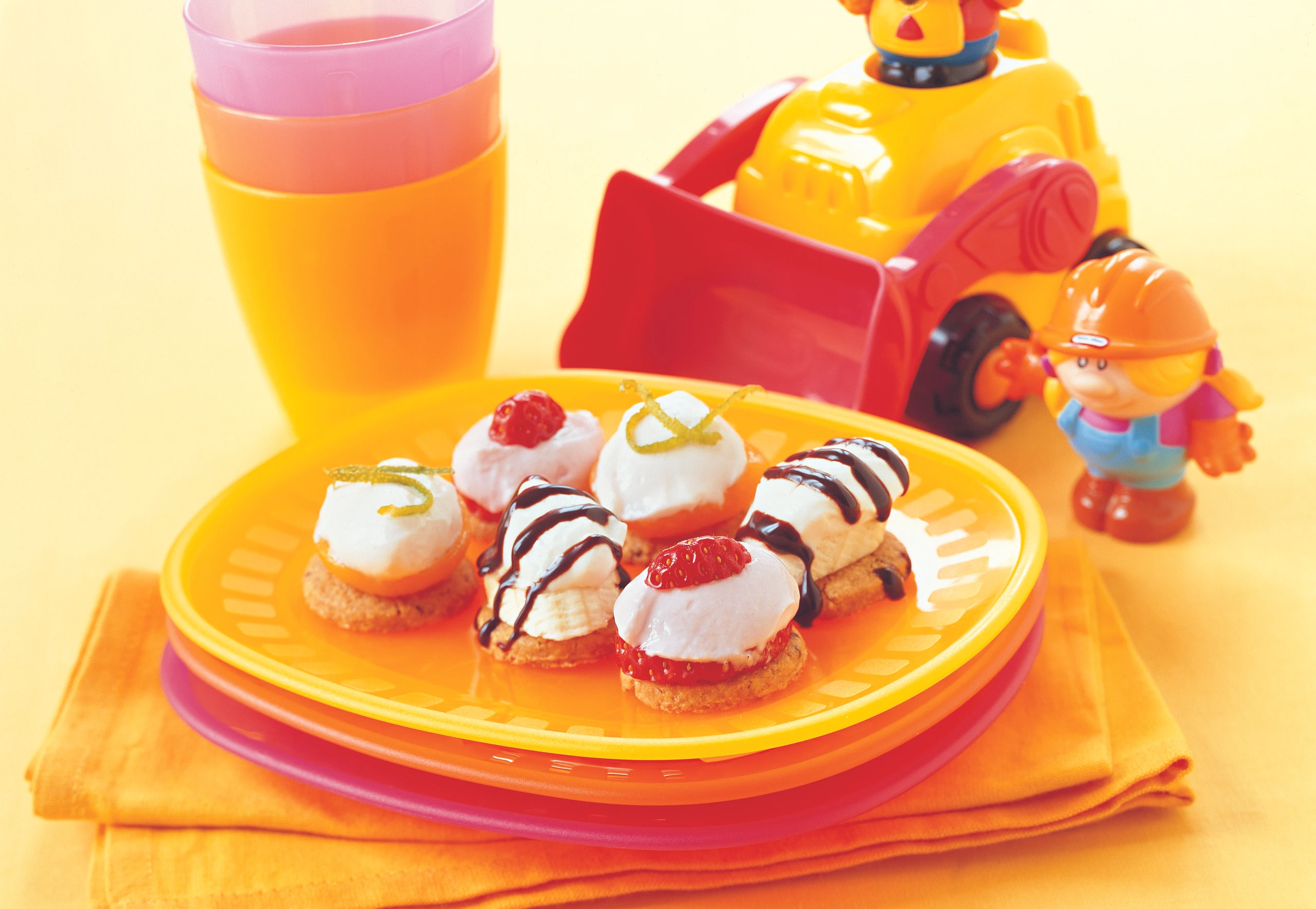 Kekse auflegen. Je 5 Kekse mit Marillen, Erdbeer- und Bananenscheiben belegen. Aus der Frischkäsemasse Nockerl ausstechen und auf die Kekse setzen.