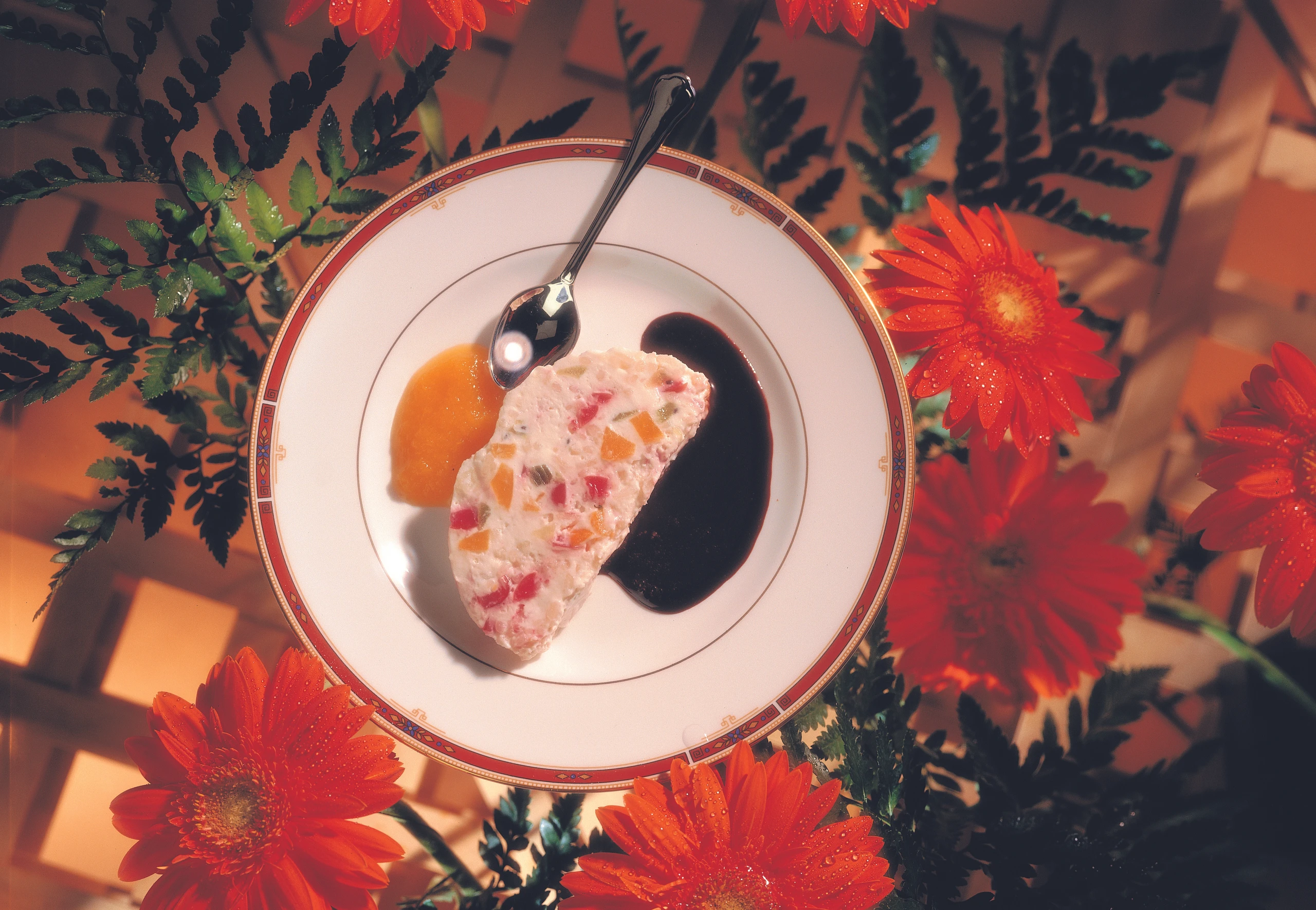 Masse in der vorbereitete Form füllen, mit Frischhaltefolie zudecken und im Kühlschrank festwerden lassen (dauert mindestens 5 Stunden). Terrine vor dem Servieren aus der Form stürzen, Folie abziehen und die Terrine in Scheiben schneiden. Dazu passt Pfirsich- und Schokoladesauce.