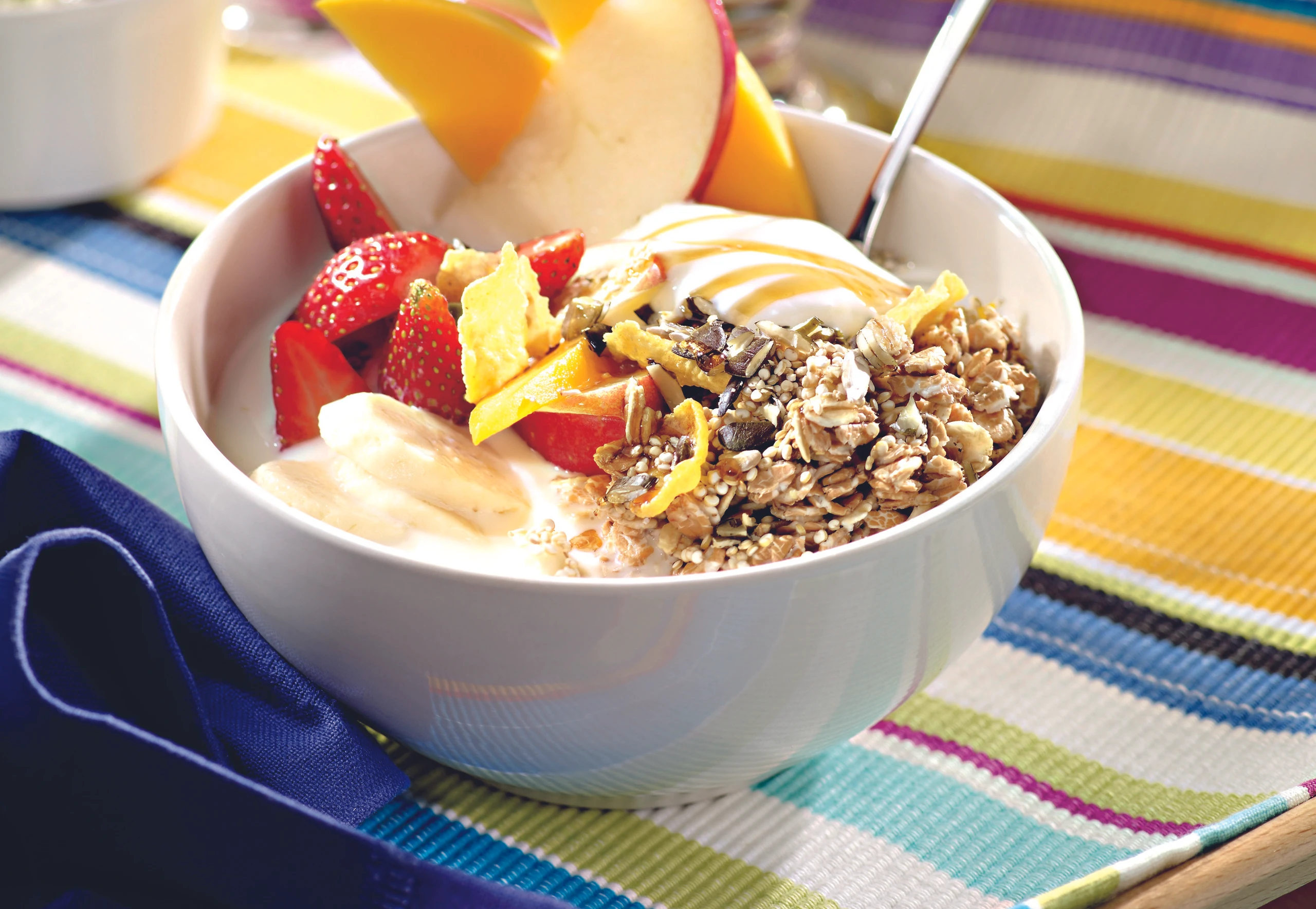 Banane und Mango schälen. Früchte nach Bedarf putzen bzw. entkernen, klein schneiden und mit Quinoa und Cornflakes unter die Flockenmischung rühren.