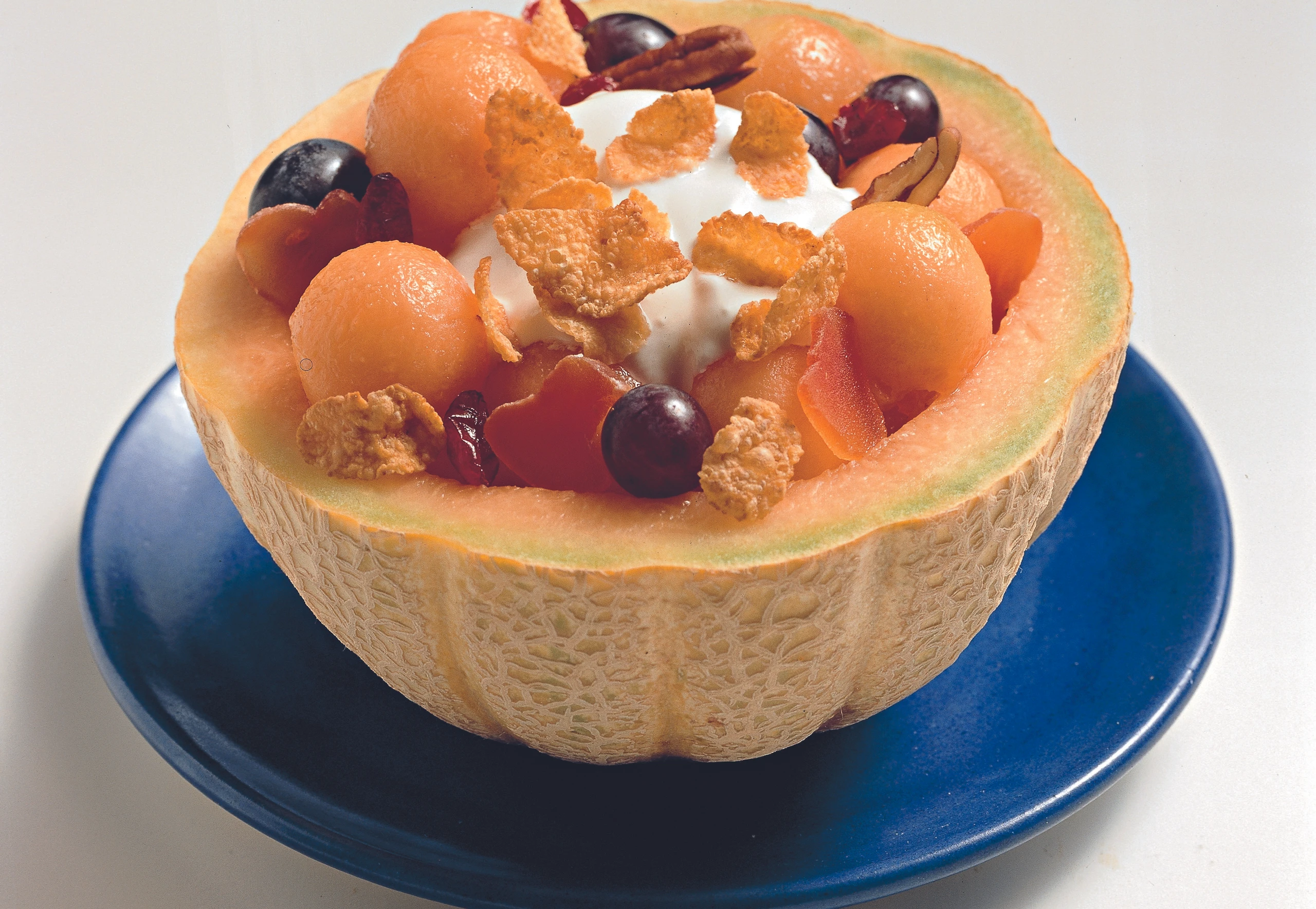 Orange auspressen, Saft mit Honig verrühren, mit Melonenkugeln und Trauben vermischen und in die ausgehöhlten Melonenhälften füllen. Joghurt verrühren, darübergießen und mit Nüssen und Trockenfrüchten bestreuen.