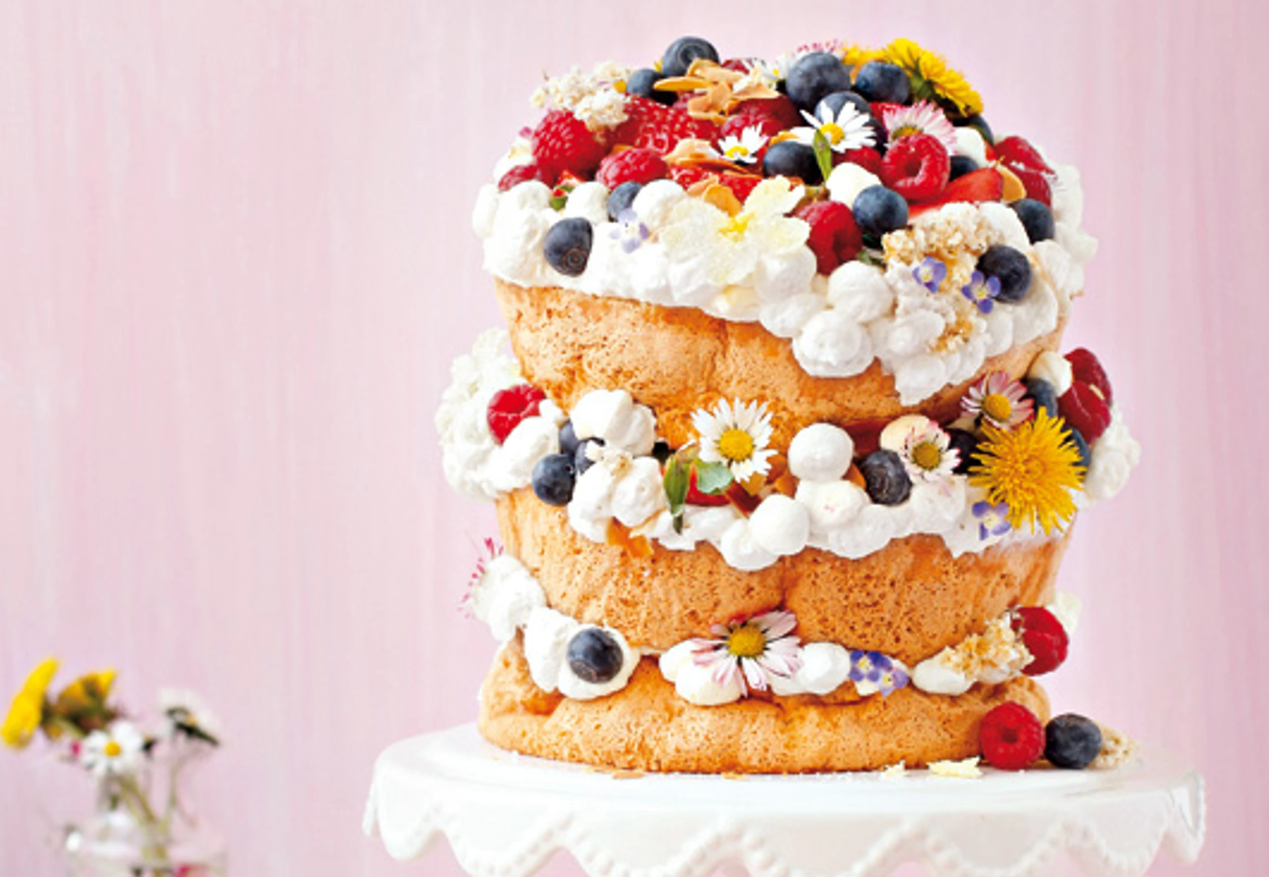 - Für die Creme Mascarpone, Topfen, Zucker, Zitronenschale und Vanillemark glatt rühren. Obers schlagen und unterheben. Creme in einen Dressiersack mit runder Tülle (Ø 10 mm) füllen. Kuchen 2 Mal durchschneiden. Creme auf die Böden dressieren, mit den Beeren belegen. Böden zusammensetzen. Torte für ca. 2 Stunden kühl stellen, vor dem Servieren mit Blüten dekorieren.