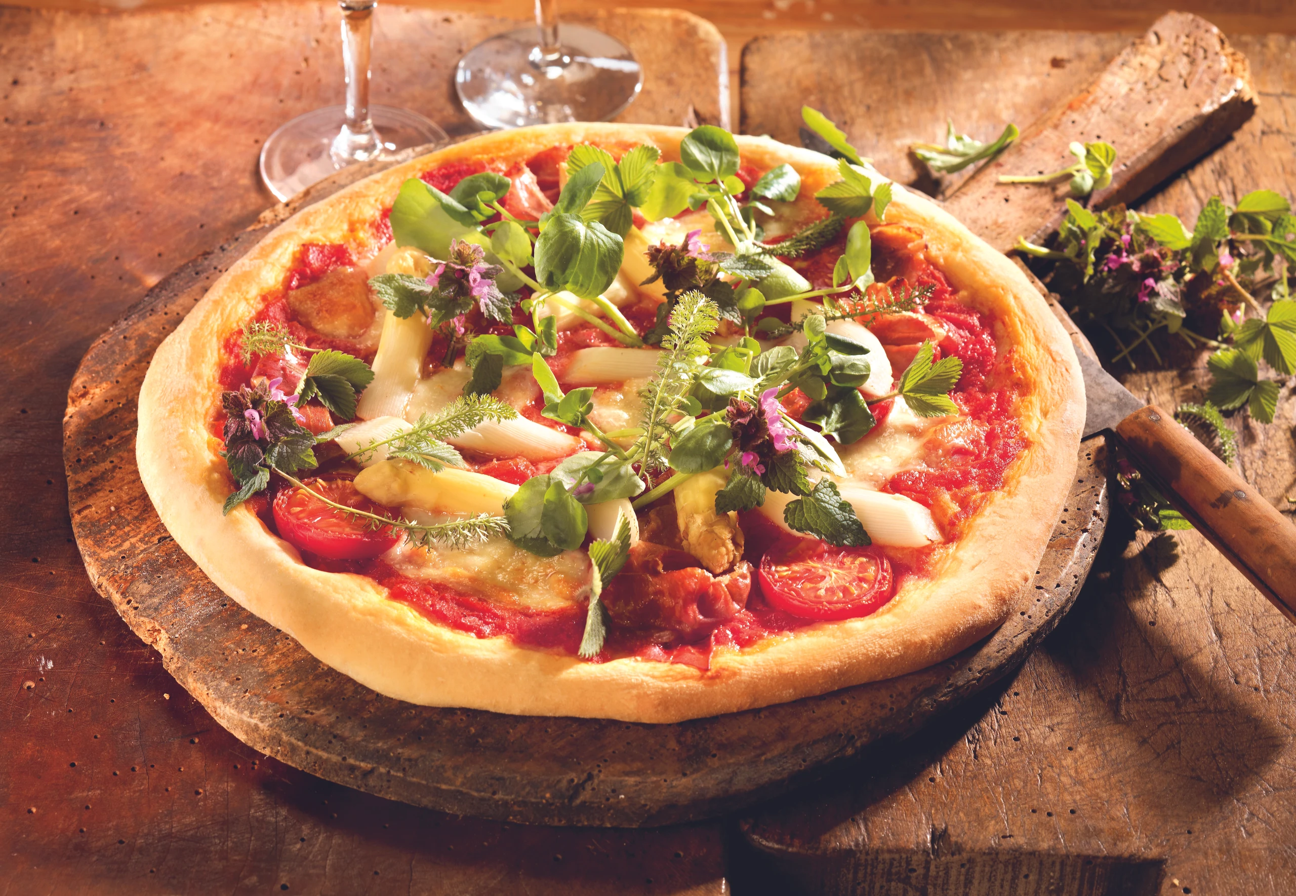 Rohr auf 230°C vorheizen (Umluft 210°C). Backblech mit Backpapier belegen. Teig vierteln, ausrollen und mit den leicht bemehlten Handrücken zu Scheiben (Ø ca. 30 cm) ausziehen. Teig auf das Blech legen, mit Paradeissauce bestreichen, mit Paradeisern, Spargel, Schinken und Mozzarella belegen.