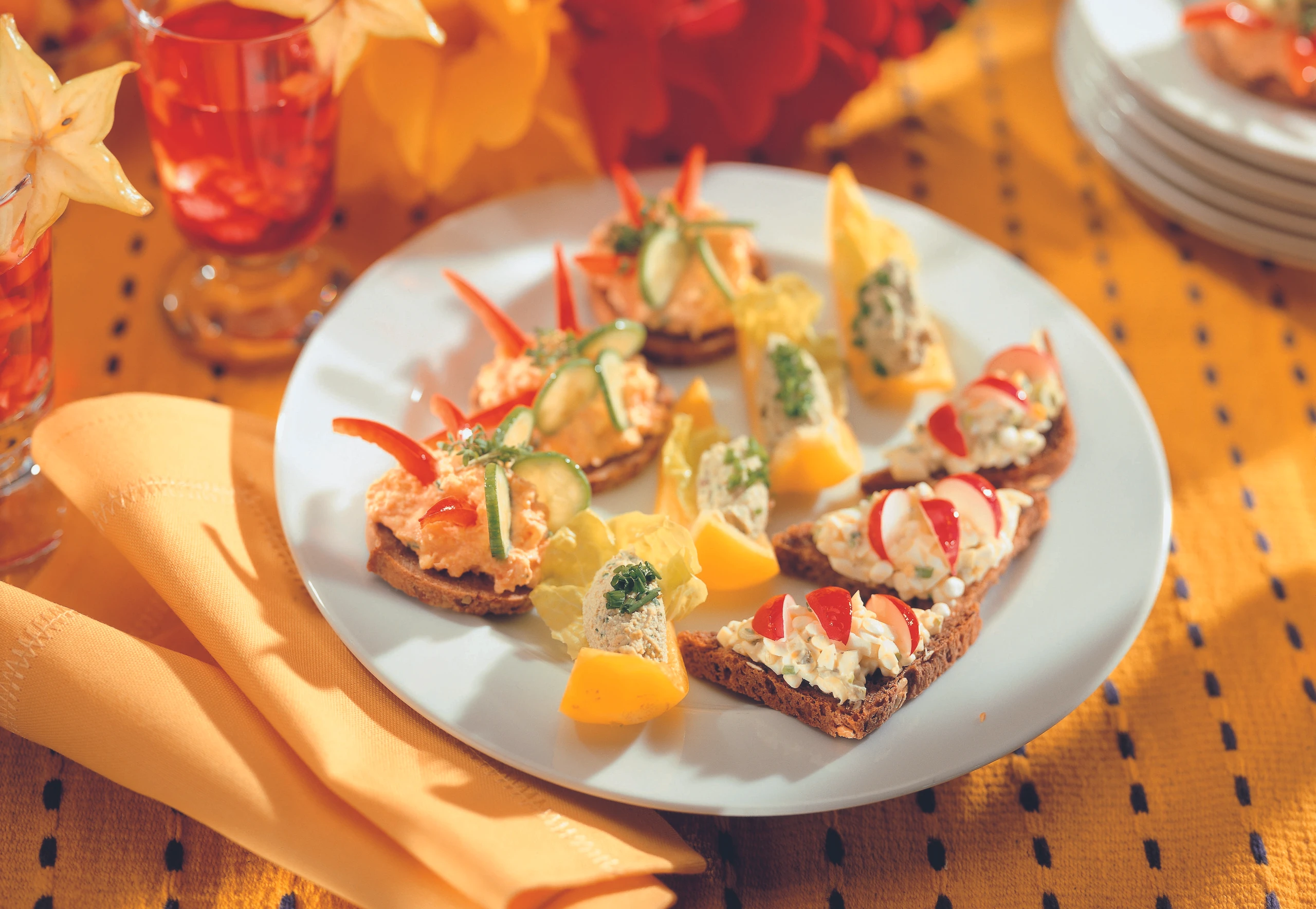 - Brote mit dem Aufstrich bestreichen und mit Gurkenscheiben, Paprikastücken und Kresseblättchen garniert anrichten.