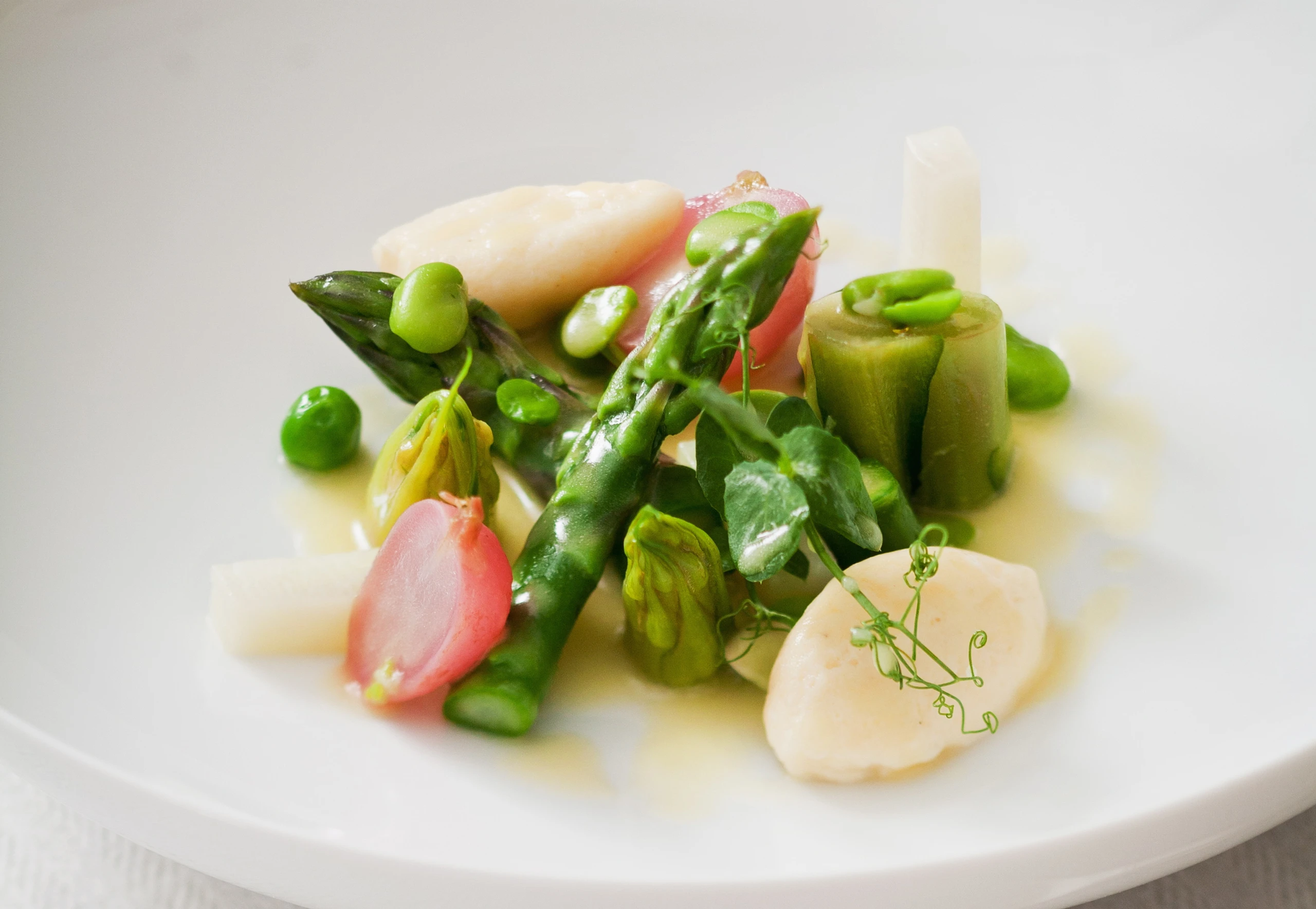 Kohlrabi schälen und in 2 cm große Stücke schneiden. Spargel schälen und quer dritteln. Radieschen putzen und halbieren. Kohlrabi, Spargel, Erbsen, Bohnen und Löwenzahn getrennt in Salzwasser bissfest kochen, abseihen, abschrecken und abtropfen lassen.