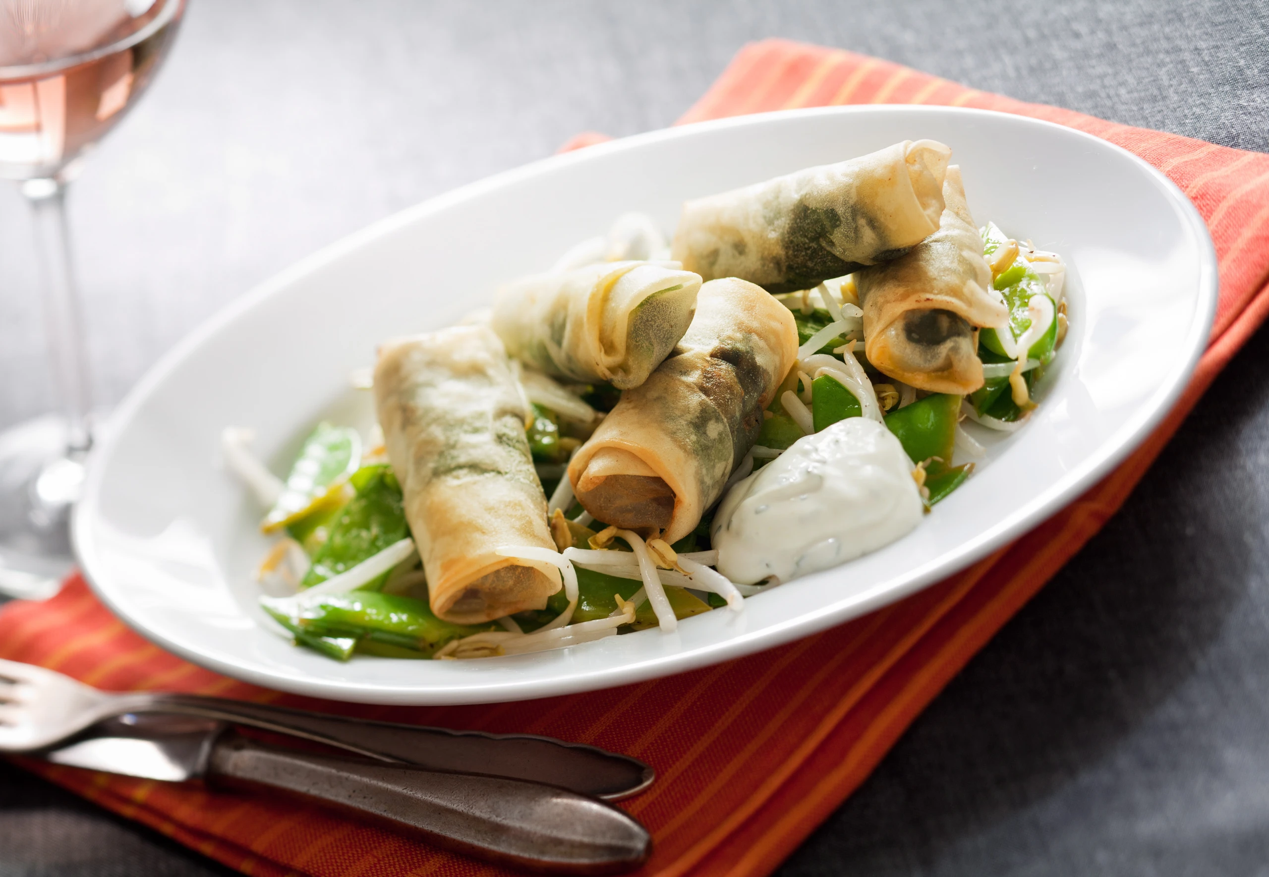 Dotter mit Stärke glatt rühren. Teigblätter flach auflegen und vierteln (es entstehen 12 Teigstücke). Jedes Teigstück am unteren Rand mit einem Fleischstück belegen. Seitenränder einschlagen. Teigränder mit der Eimischung bestreichen und den Teig einrollen. 3 Finger hoch Öl erhitzen. Frühlingsröllchen darin backen, herausheben, abtropfen lassen, mit Wasabirahm und Salat anrichten.