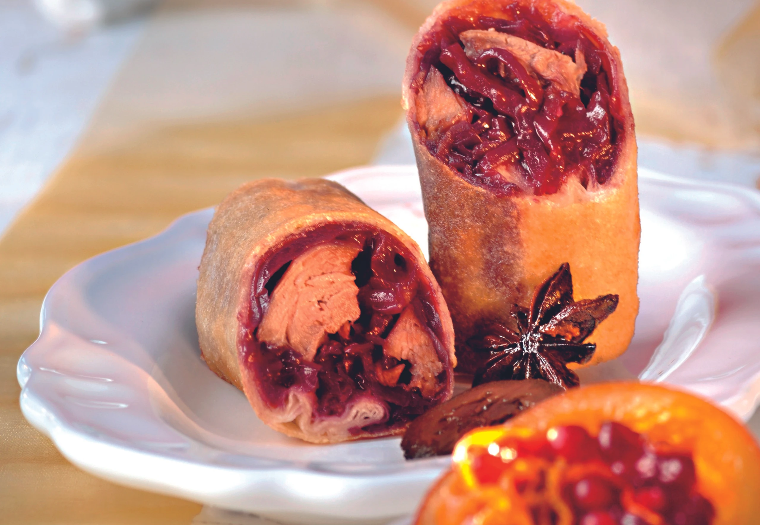 Inzwischen Krautkopf vierteln, Strunk herausschneiden. Kraut in feine Streifen schneiden (Brotschneidemaschine). Gewürze in ein Teefilter füllen. Butterschmalz erhitzen, Zucker darin schmelzen. Essig, Portwein und Kraut zugeben, Orangensaft zugießen. Gewürze zugeben. Kraut ca. 30 Minuten offen köcheln.