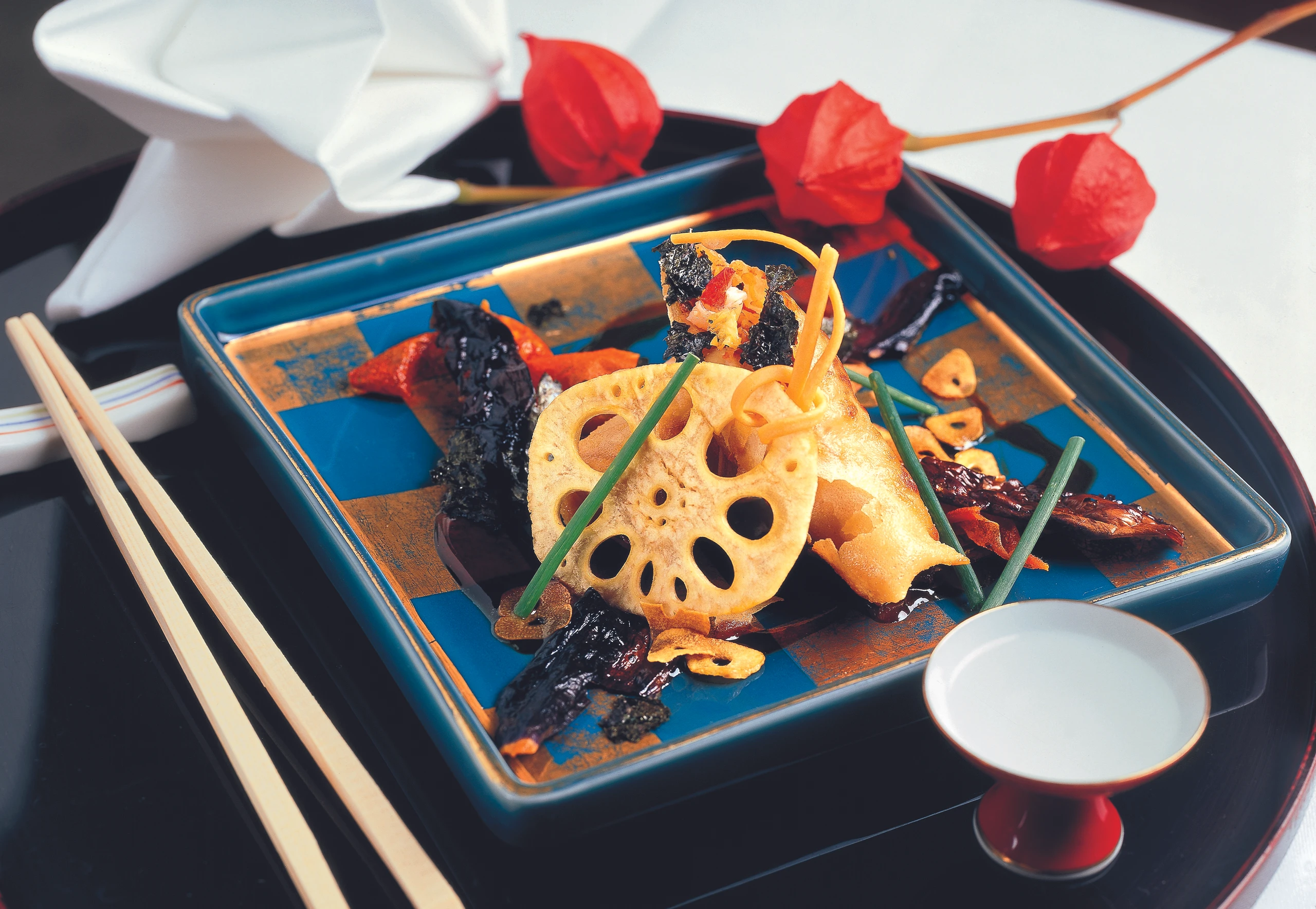 - Finger hoch Öl erhitzen, Lotosscheiben, dann die Paradeiserhaut darin goldgelb backen, herausheben und abtropfen lassen.