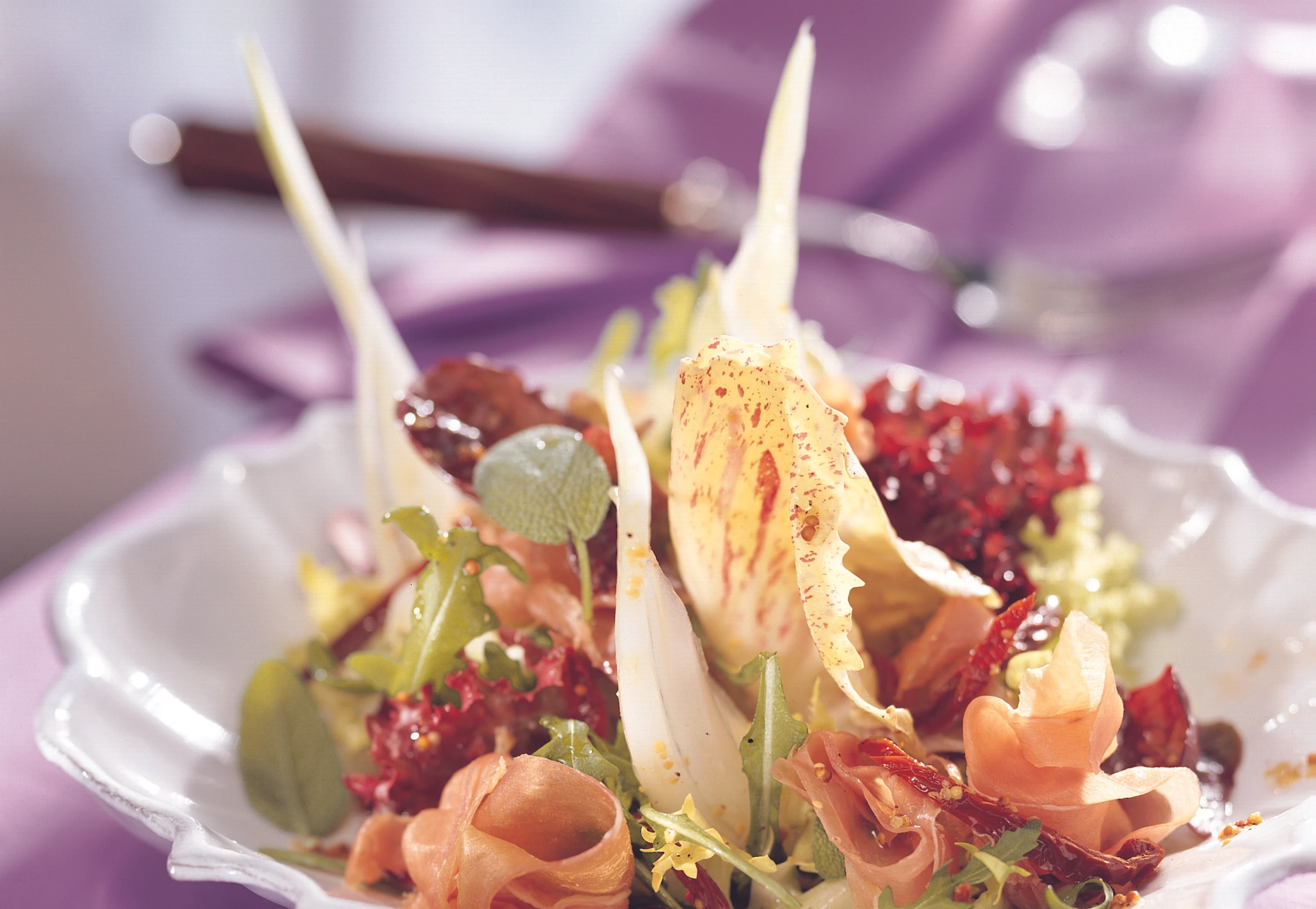 Salatblätter mit Marinade vermischen, abtropfen lassen und mit Fenchel, Paradeisern, Prosciutto und Salbei anrichten. Salat mit der abgetropften Marinade beträufeln.