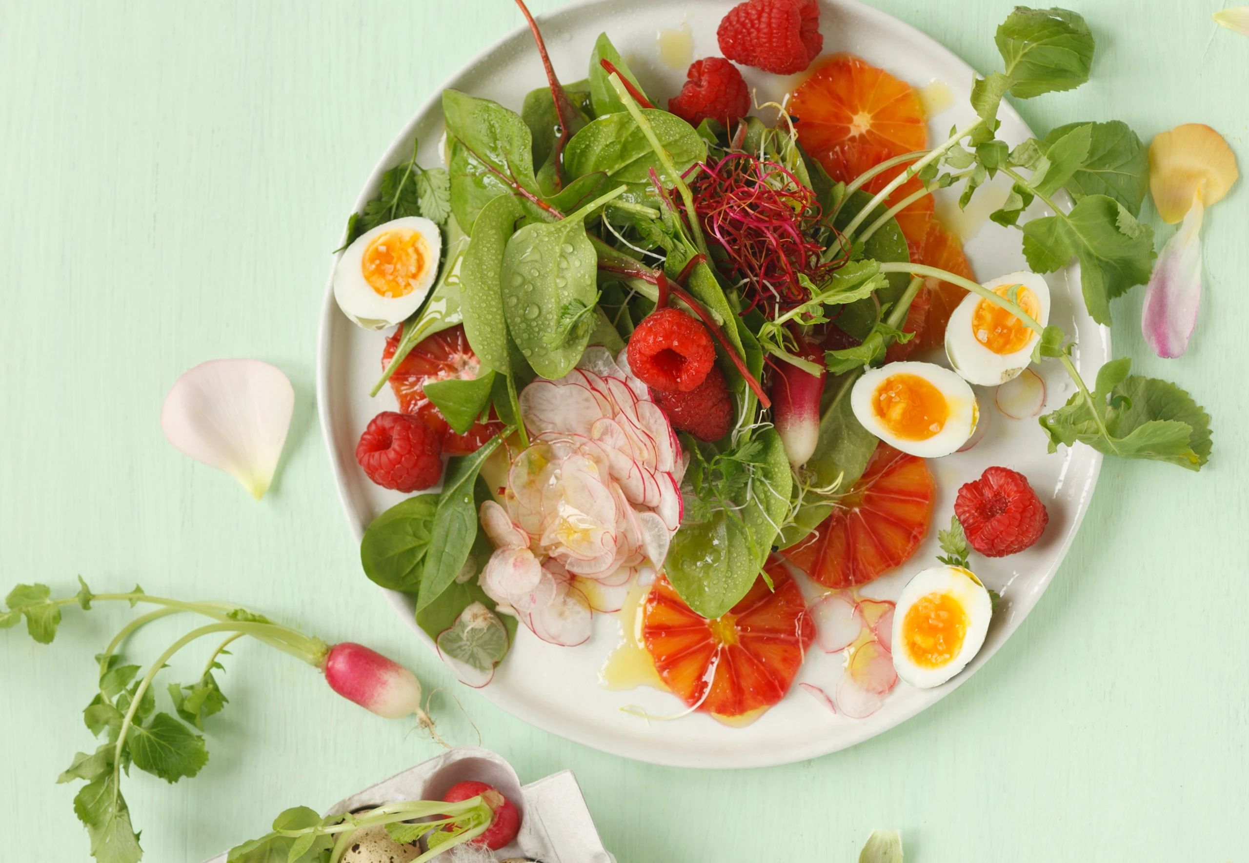 Blutorangen mit einem Messer so schälen, dass auch die weiße Innenhaut entfernt wird. Orangen in Scheiben schneiden. Spinat, Radieschen, Sprossen, Himbeeren und Orangen auf Tellern anrichten.