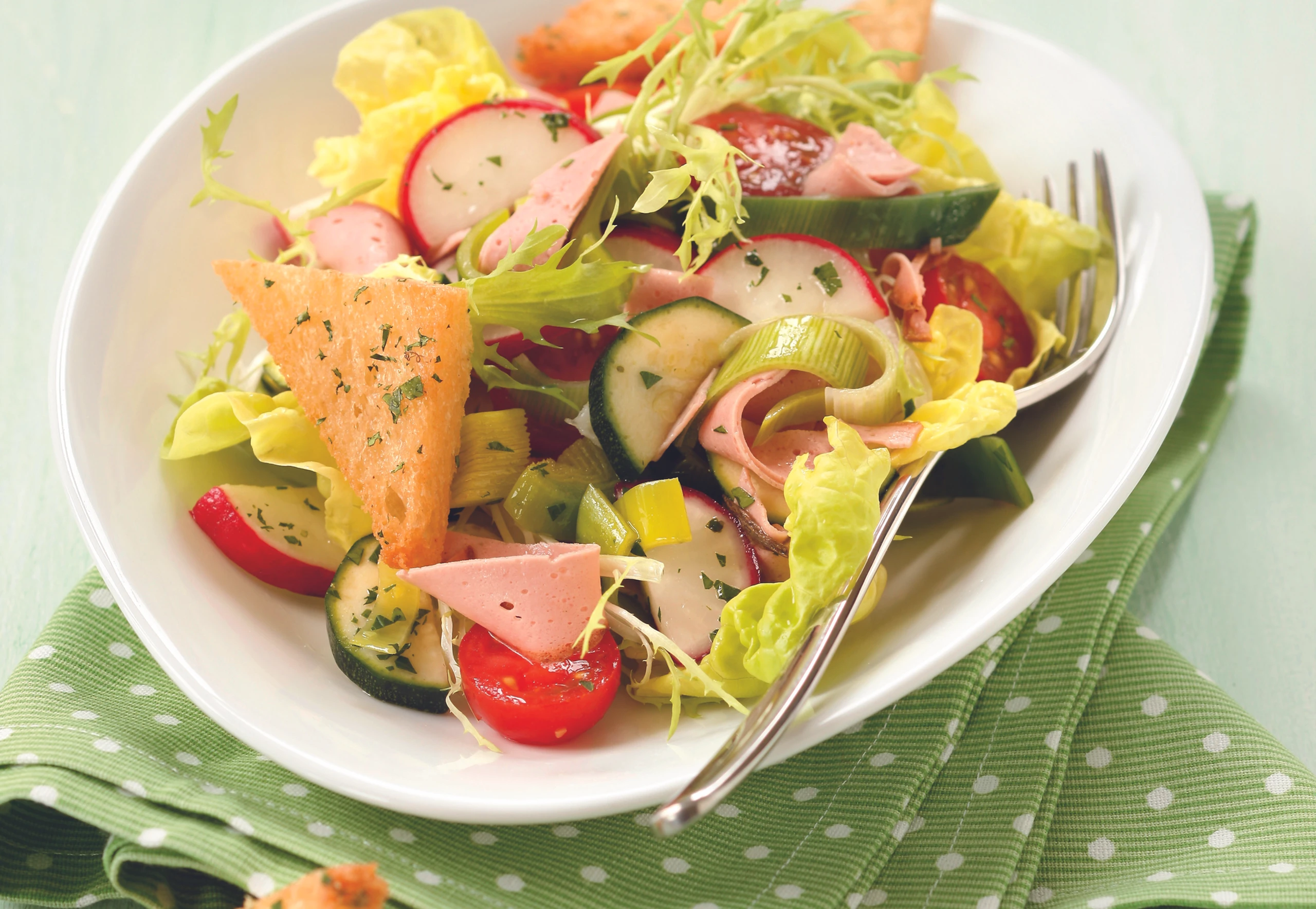 - Salate, Paradeiser, Radieschen, Zucchini, Lauch und Leberkäse mit der Marinade vermischen. Salat mit Brotstücken garniert servieren.