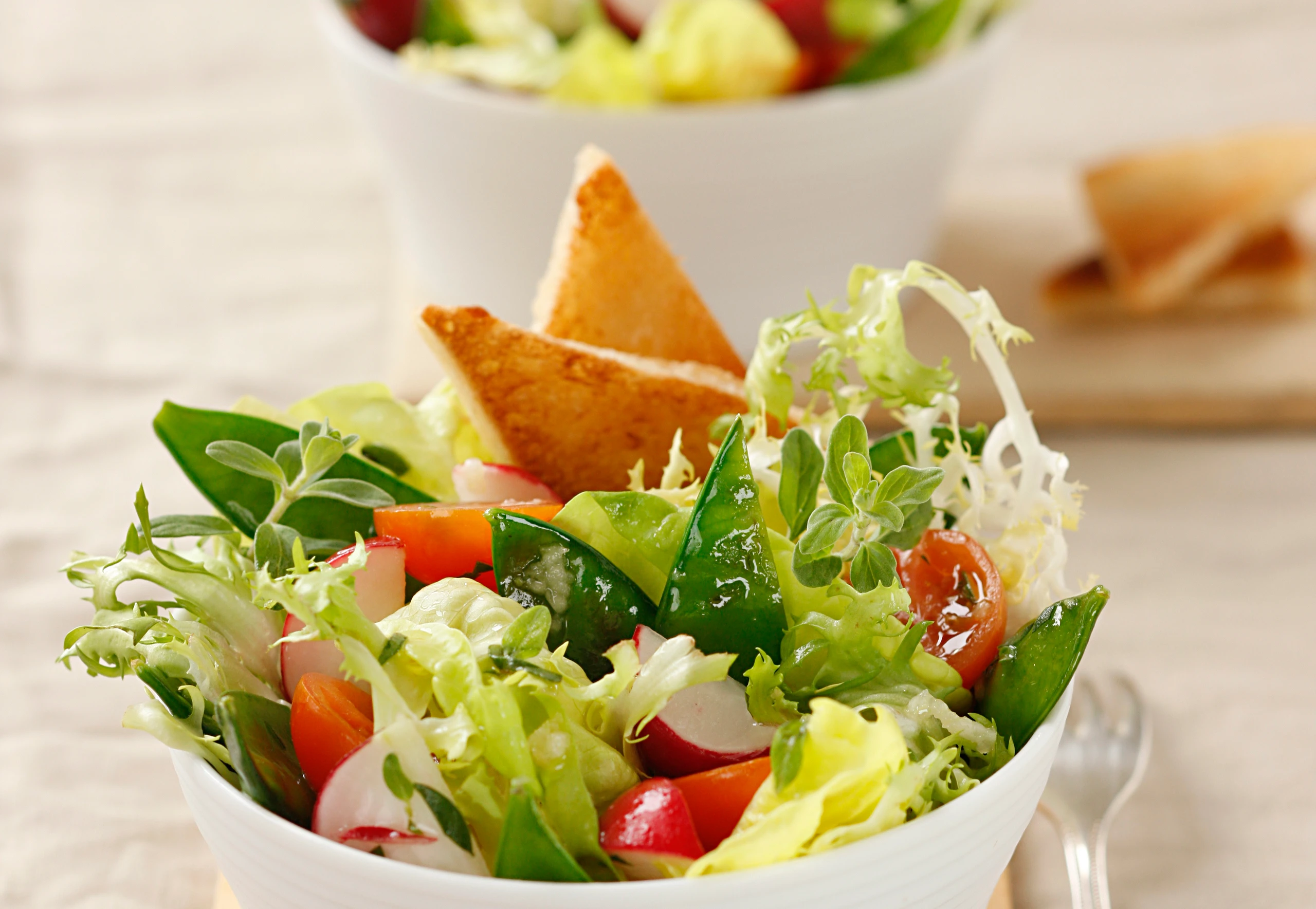 - Für die Marinade Essig mit Salz, Pfeffer und zerdrücktem Knoblauch vermischen. Öl unter kräftigem Rühren in feinem Strahl zugießen. Salate, Paradeiser, Radieschen und Majoran mit der Marinade vermischen. Salat anrichten und mit den Toasts garniert servieren.