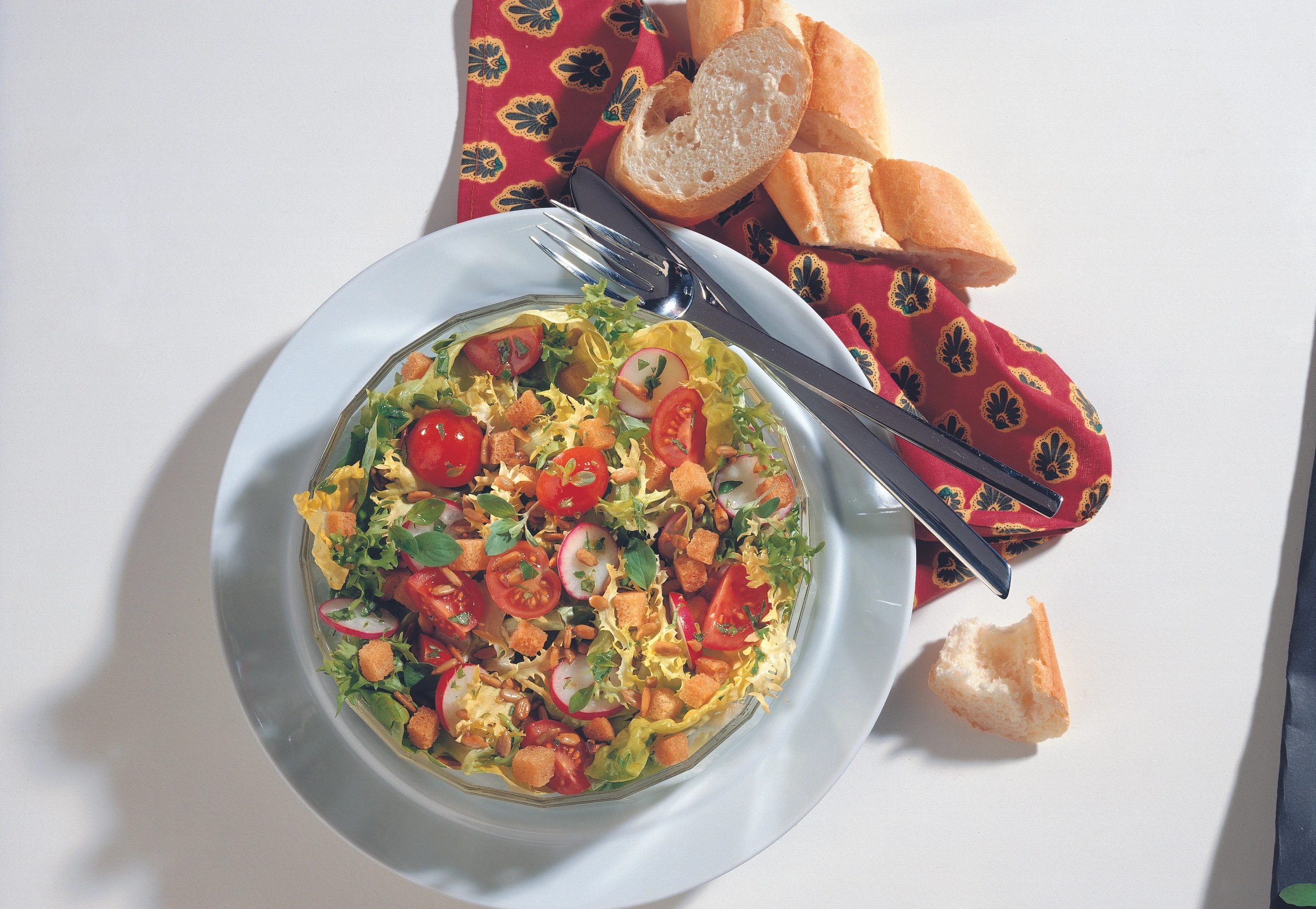 Salate, Paradeiser und Radieschen mit der Marinade übergießen und behutsam vermischen. Salat mit Sonnenblumenkernen und gerösteten Brotwürfeln bestreut anrichten.