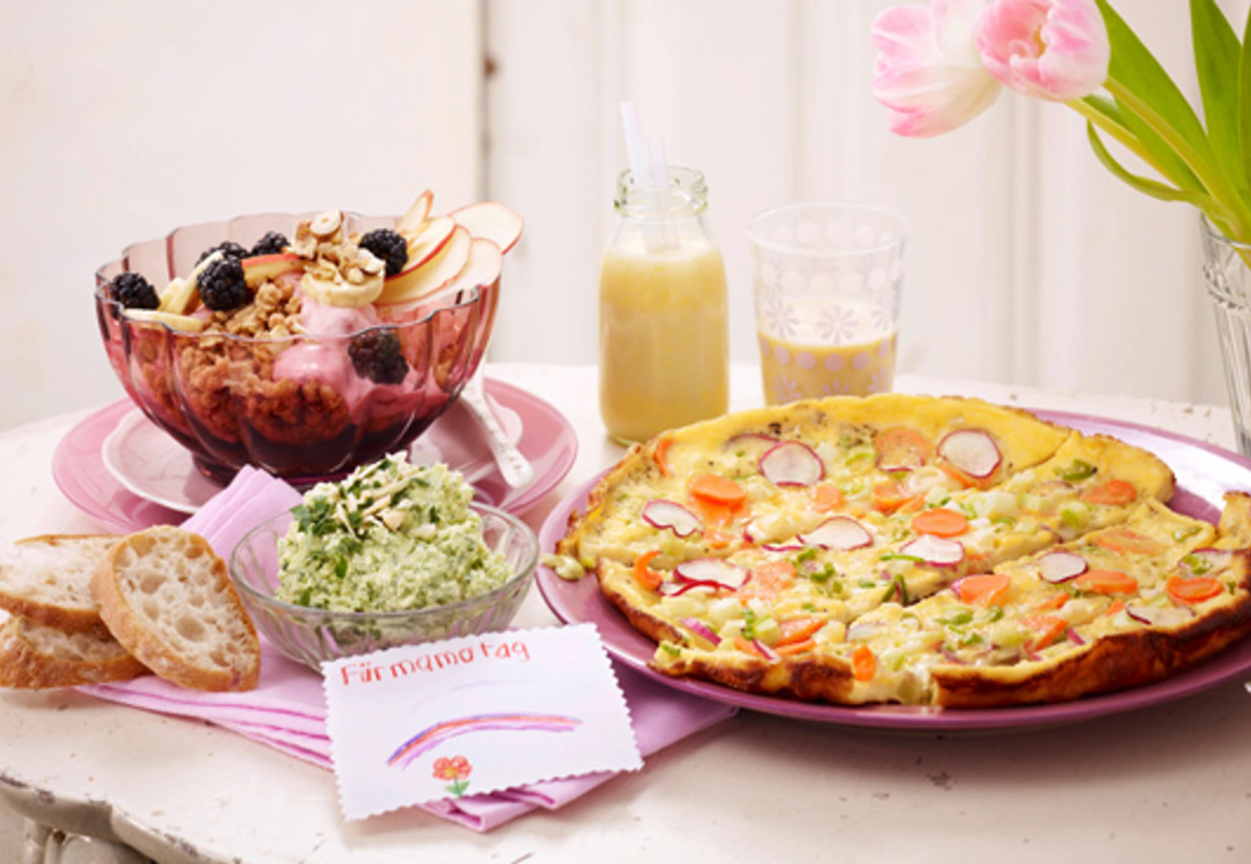 - Eier mit Obers verquirlen, mit Salz und Pfeffer würzen. In einer beschichteten Pfanne 1 EL Öl erhitzen, Eimischung eingießen, mit dem Gemüse bestreuen und bei schwacher Hitze cremig stocken lassen (ca. 10 Minuten). Frittata vor dem Servieren in Stücke schneiden.