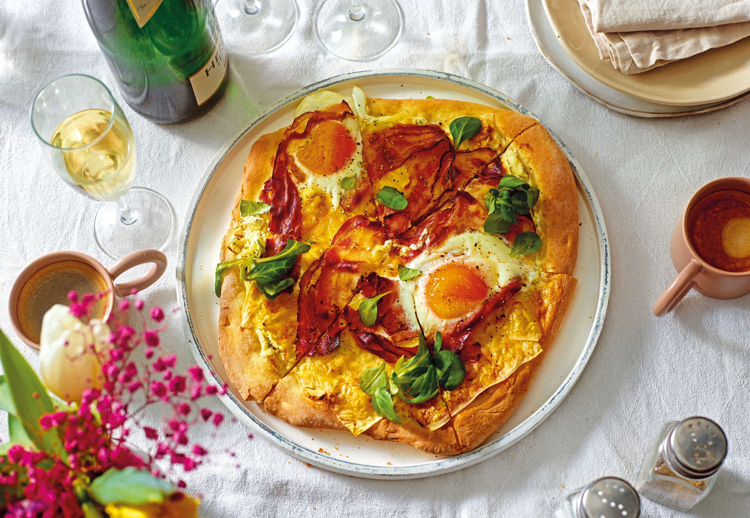 Frühstücksfladen mit Bergkäse, Speck und Spiegeleiern