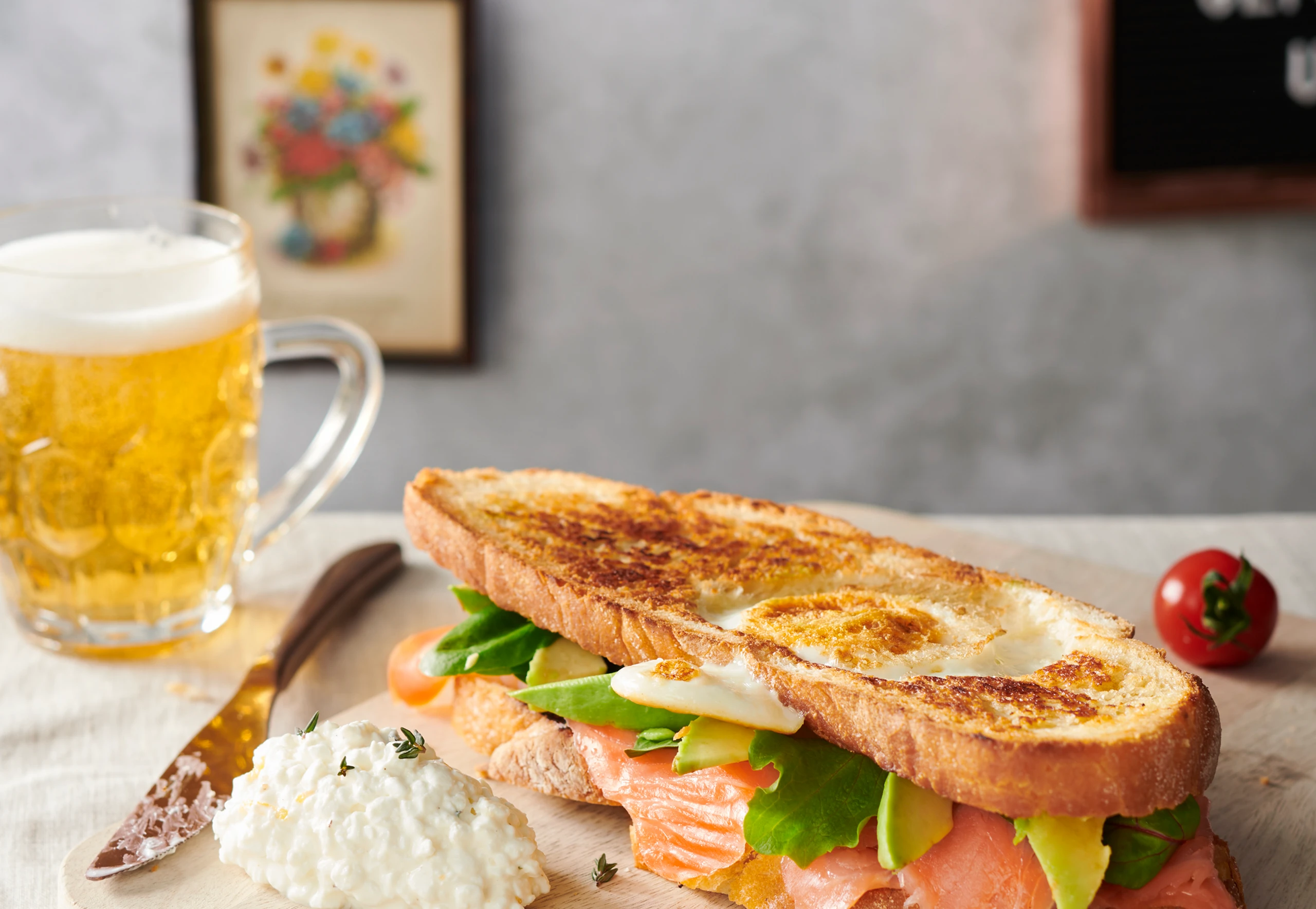 Avocados halbieren und den Kern entfernen. Fruchtfleisch mit einem Löffel aus der Schale lösen und in Scheiben schneiden. Brotscheiben ohne Loch mit Lachs, Avocadostücken und Salat belegen. Ei-Brotscheiben darauf legen.