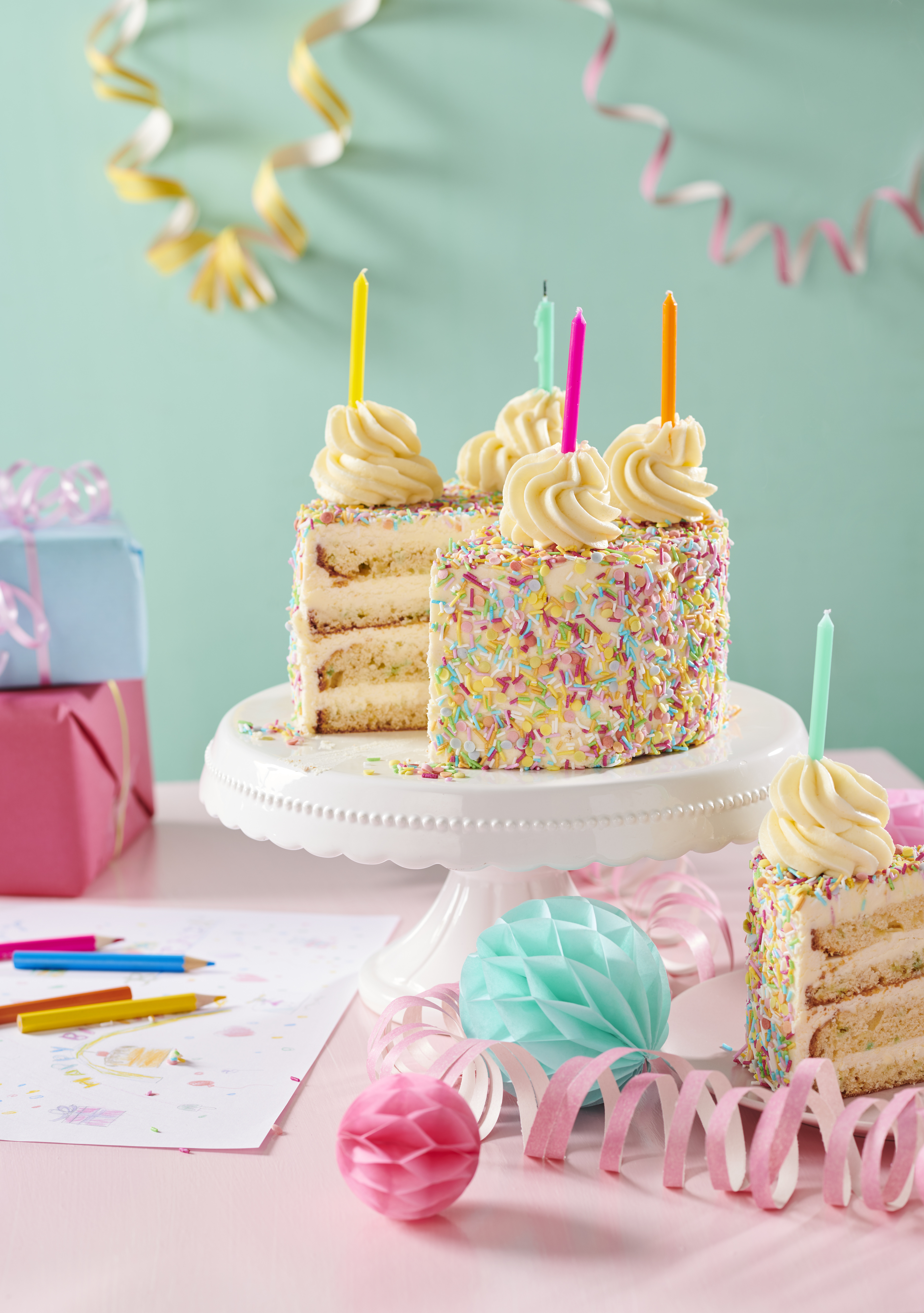 Funfetti-Torte mit weißer Schokocreme