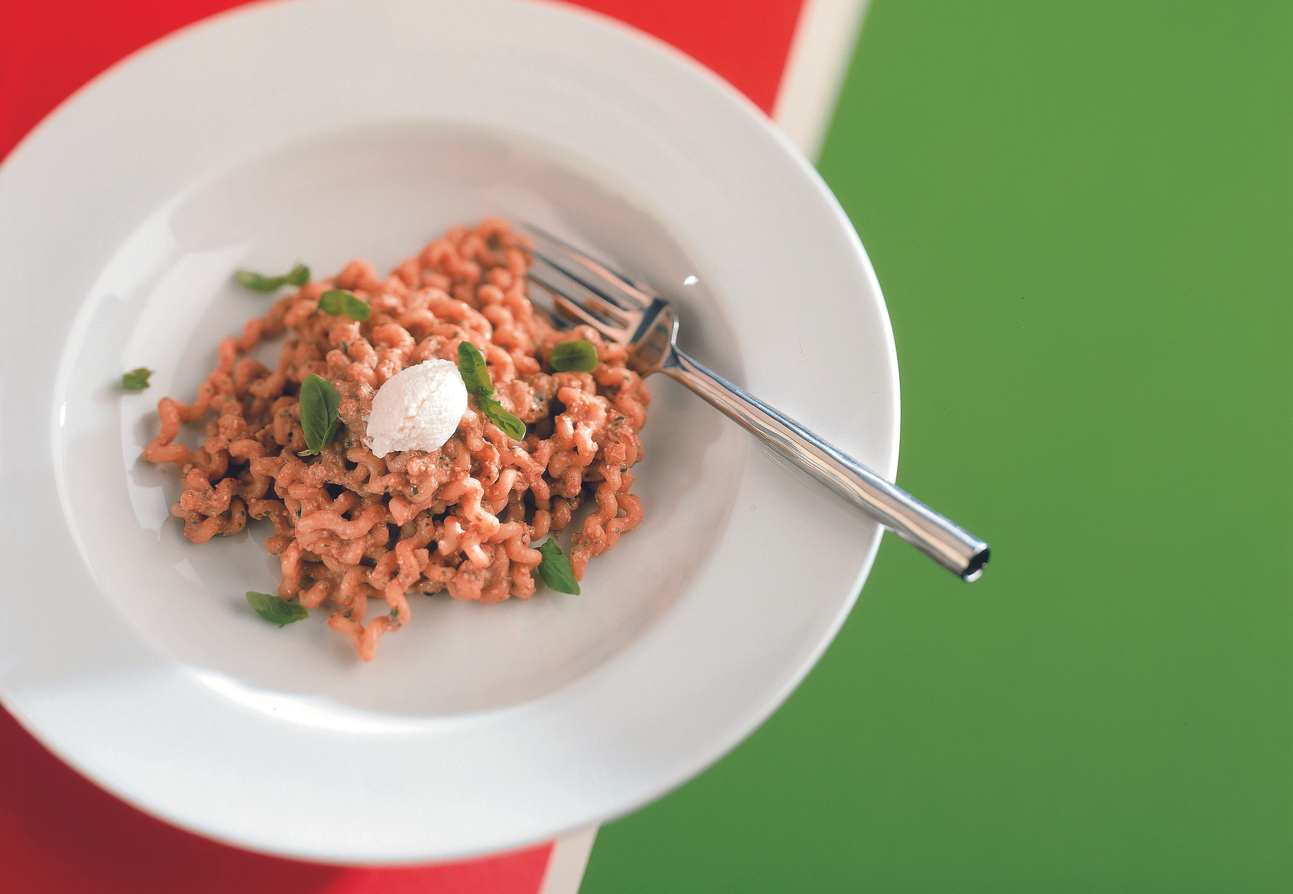 Pasta mit Ricotta und Basilikumblättern garniert servieren.