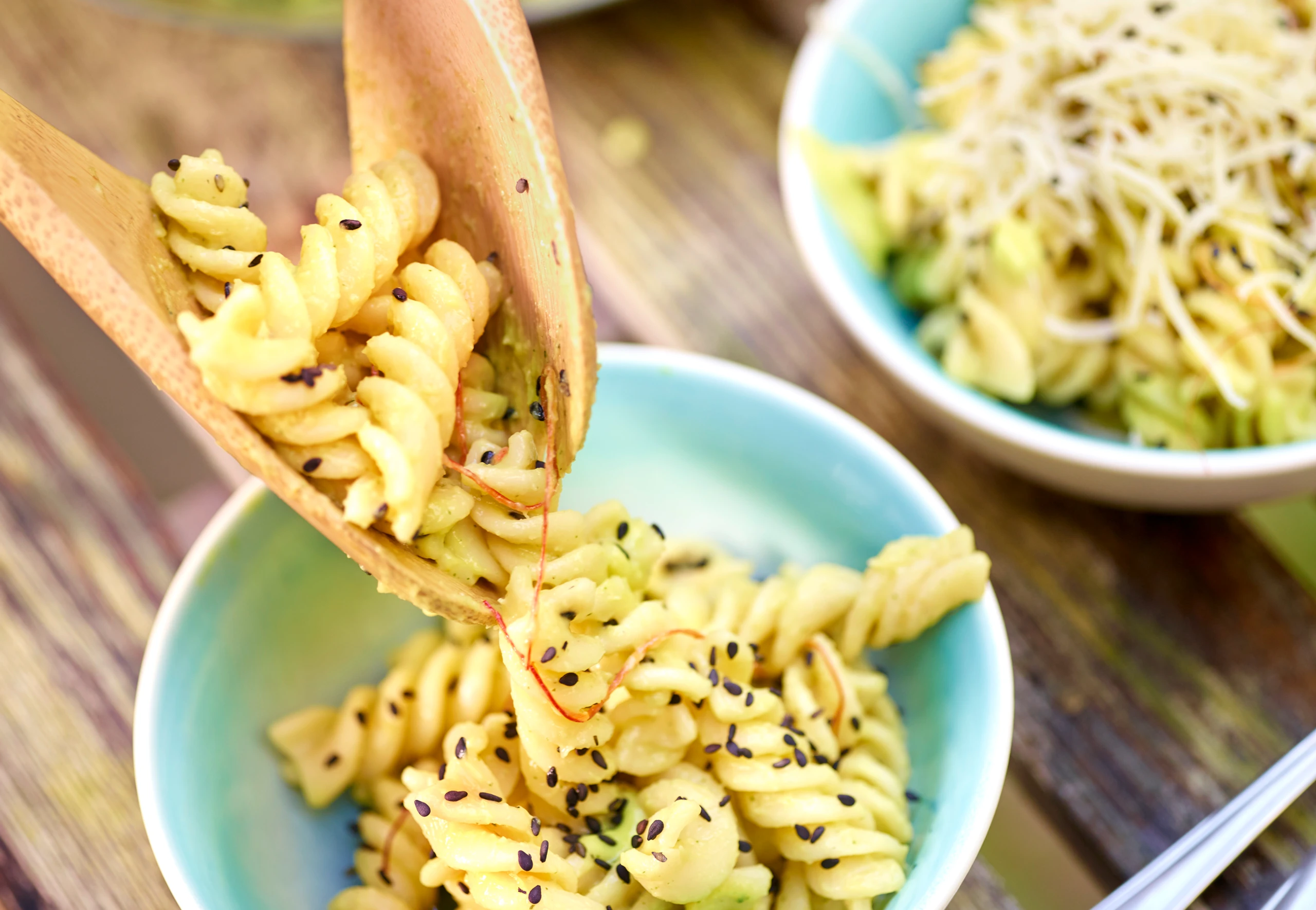 Parallel dazu Fusilli in Salzwasser kochen, abseihen und abtropfen lassen. Fusilli mit Sauce und 1 EL vom Parmesan verrühren, kurz ziehen lassen. Sesam und Chilifäden untermischen. Fusilli anrichten und mit übrigem Parmesan bestreut servieren.