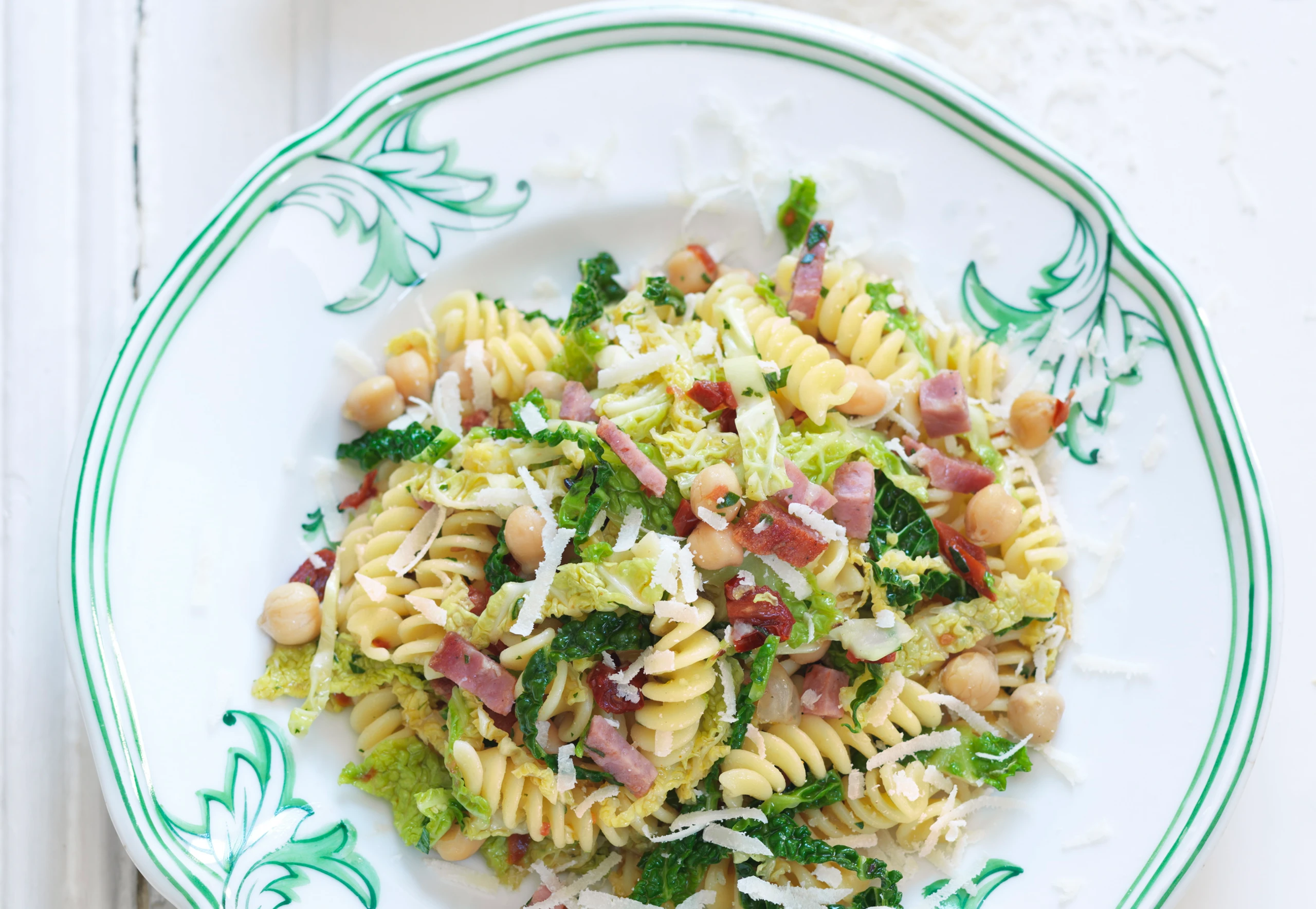 Kichererbsen in ein Sieb leeren, kalt spülen und abtropfen lassen. Vom Kohl die Mittelrippen ausschneiden. Kohl in ca. 1 cm breite Streifen schneiden. Salami und Paradeiser klein schneiden und in 3 EL Öl anschwitzen.