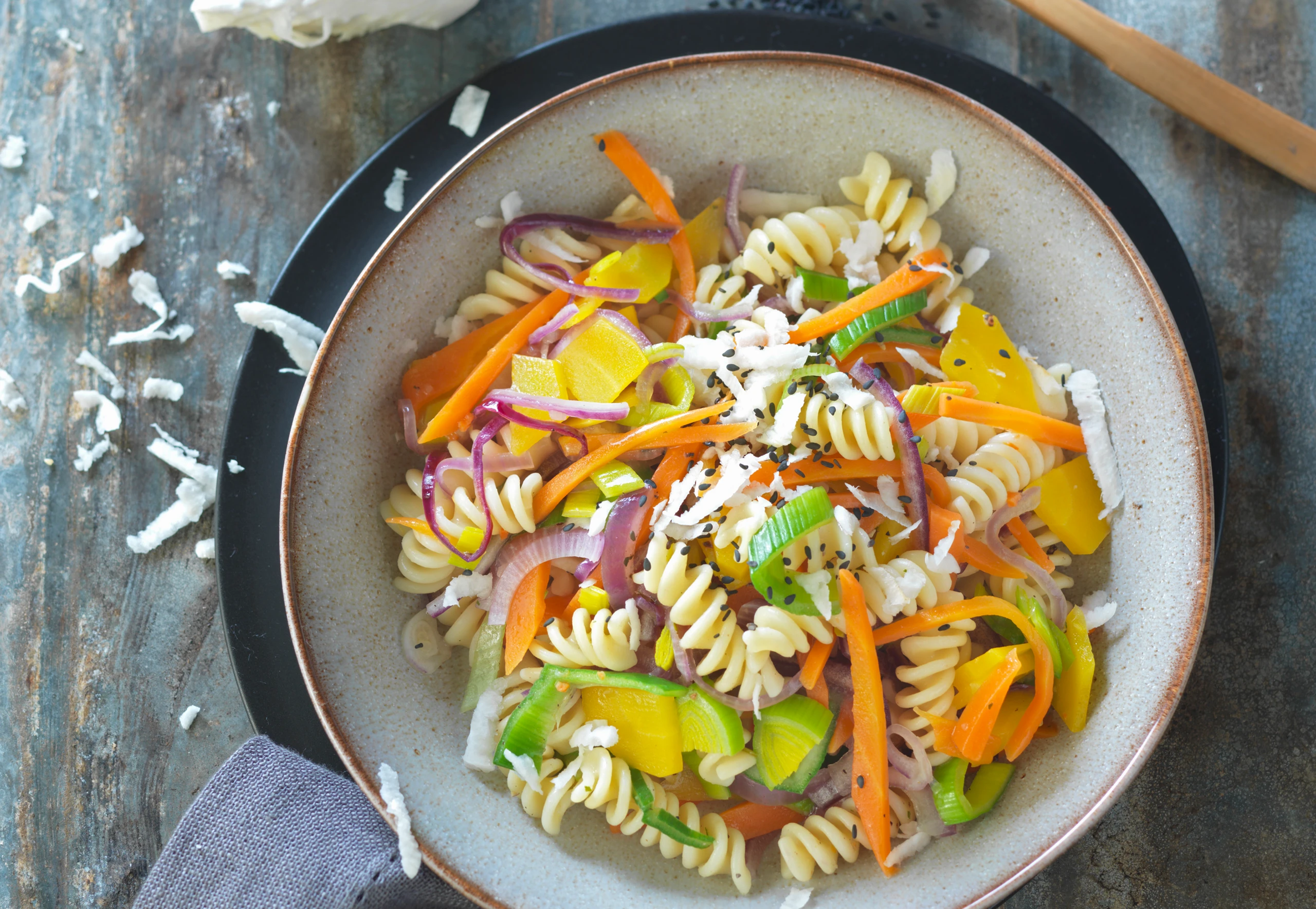 Fusilli unter das Gemüse rühren, salzen, pfeffern, mit Rettich und Sesam bestreut servieren.
