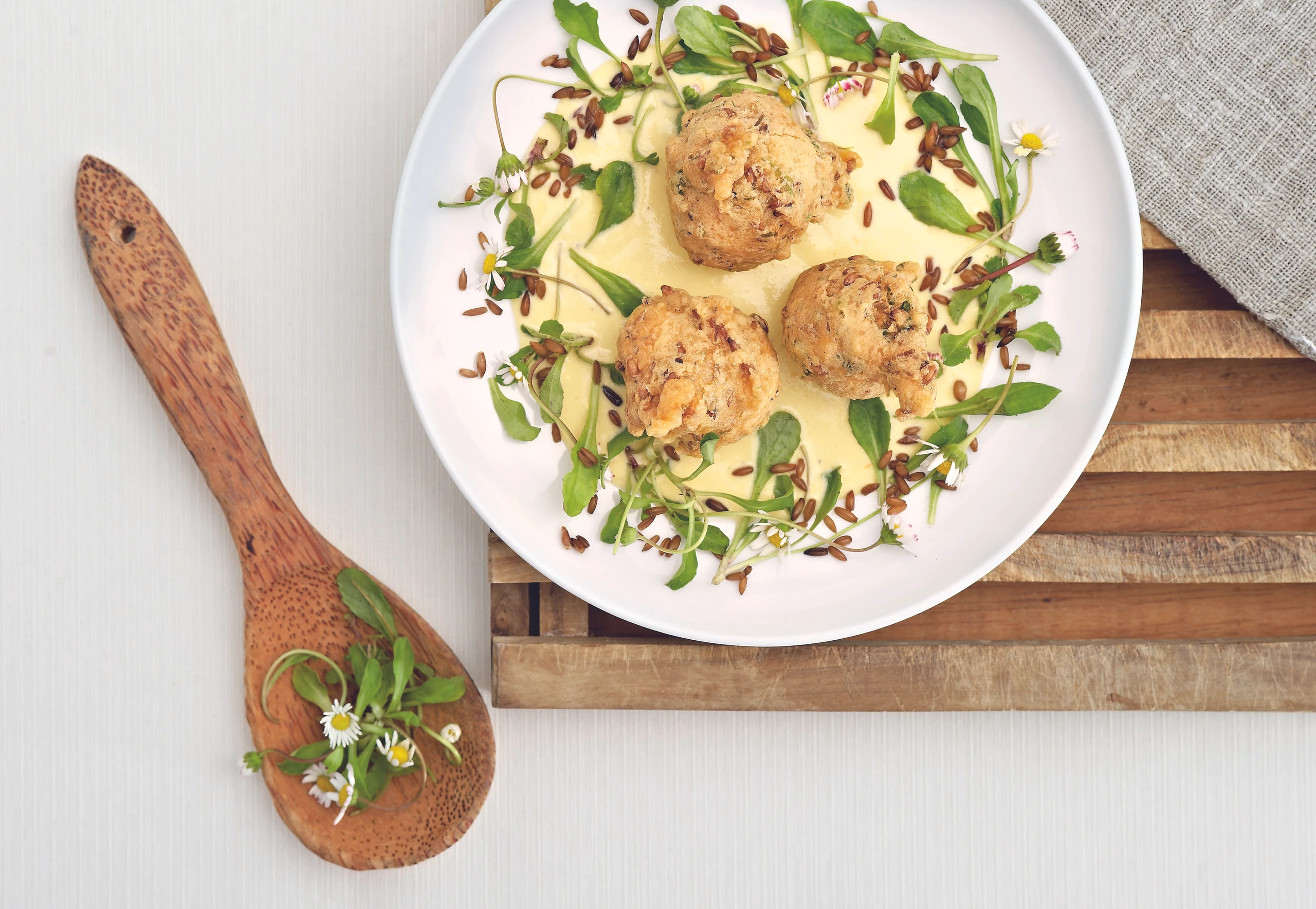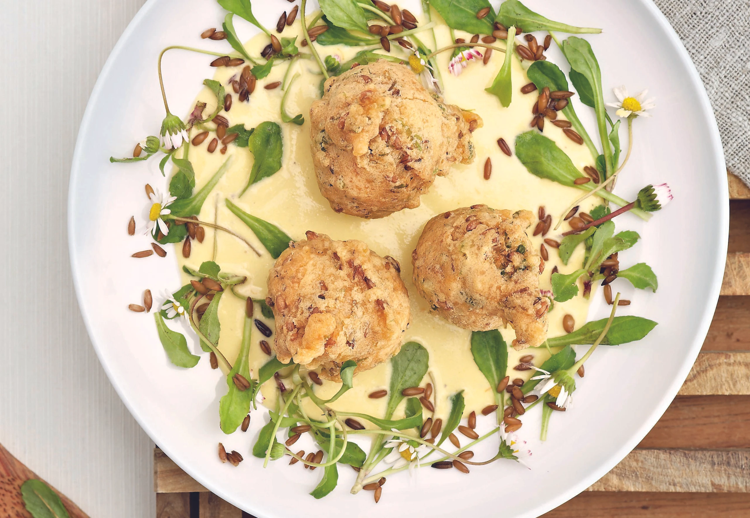 Beignets mit einem Gitterlöffel herausnehmen, auf Küchenpapier abtropfen lassen. Beignets mit Safransauce servieren, mit Gänseblümchen und gekochtem Waldstaudenkorn garnieren.