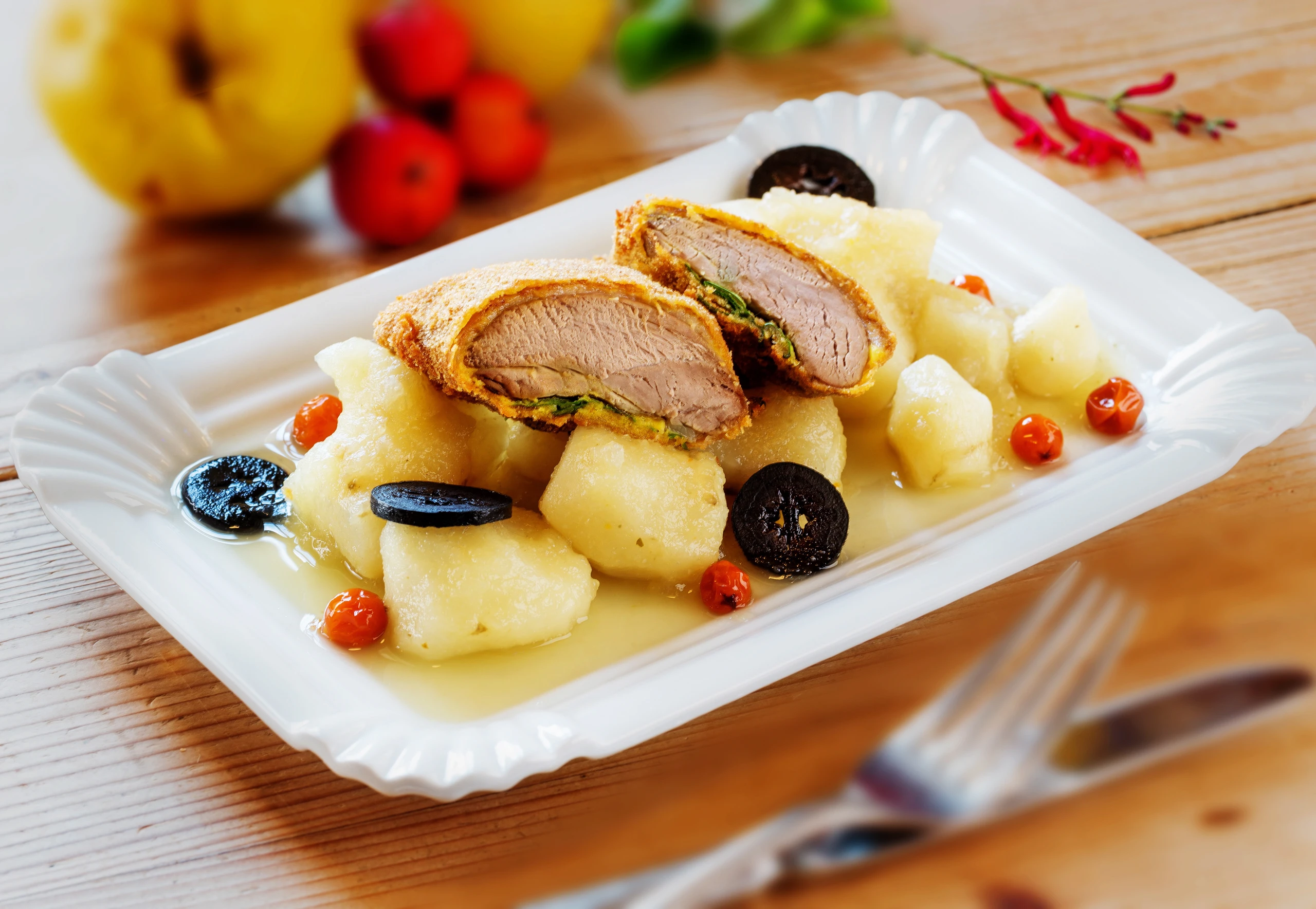 - Für die Garnitur Nüsse in Scheiben schneiden. Brüste mit Salbei belegen und in Mehl, Eiern und Bröseln panieren. 3 Finger hoch Öl erhitzen, Brüste darin goldbraun backen. Herausheben, auf Küchenpapier abtropfen lassen und quer in Scheiben schneiden. Gänsebrüste mit Topinambur anrichten, mit Nüssen und Vogelbeeren garniert servieren.