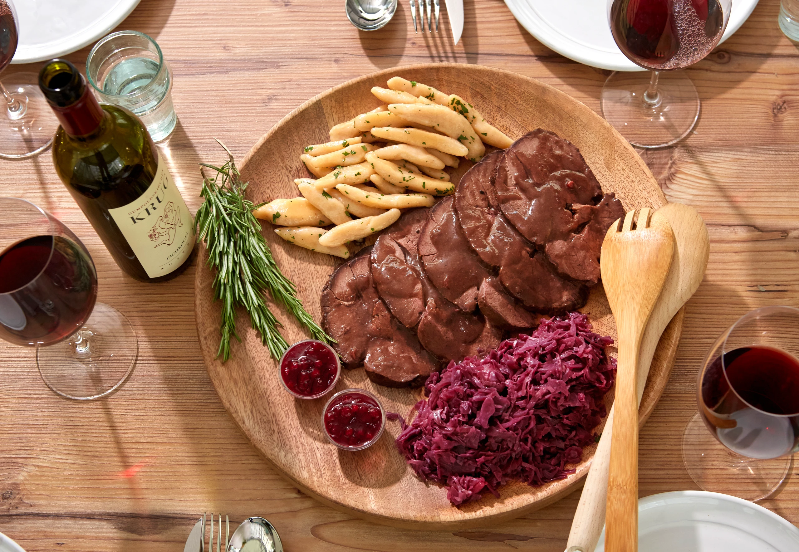 Schlögel aus dem Rohr nehmen, in Alufolie wickeln und ca. 5 Minuten rasten lassen. Thymian und Rosmarin aus der Sauce nehmen. Restliche Butter und Preiselbeeren zugeben, Sauce pürieren und mit Salz und Pfeffer abschmecken. Schlögel in Scheiben schneiden und mit den Beilagen servieren.