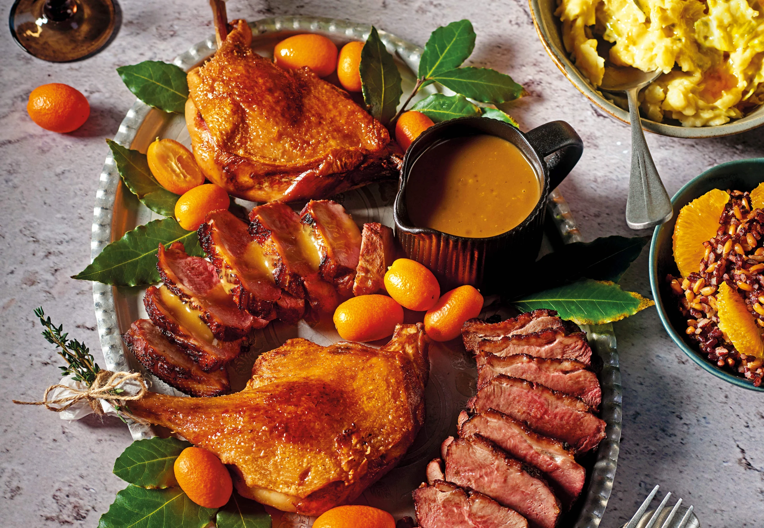 Rohr auf 220 °C Oberhitze aufheizen. Keulen und Brustfilets ca. 15 Minuten knusprig anbraten (2. Schiene von oben). Herausnehmen und ca. 10 Minuten ruhen lassen. Auf einer Platte anrichten. Mit Kumquats und Lorbeer dekorieren und mit der Sauce servieren.