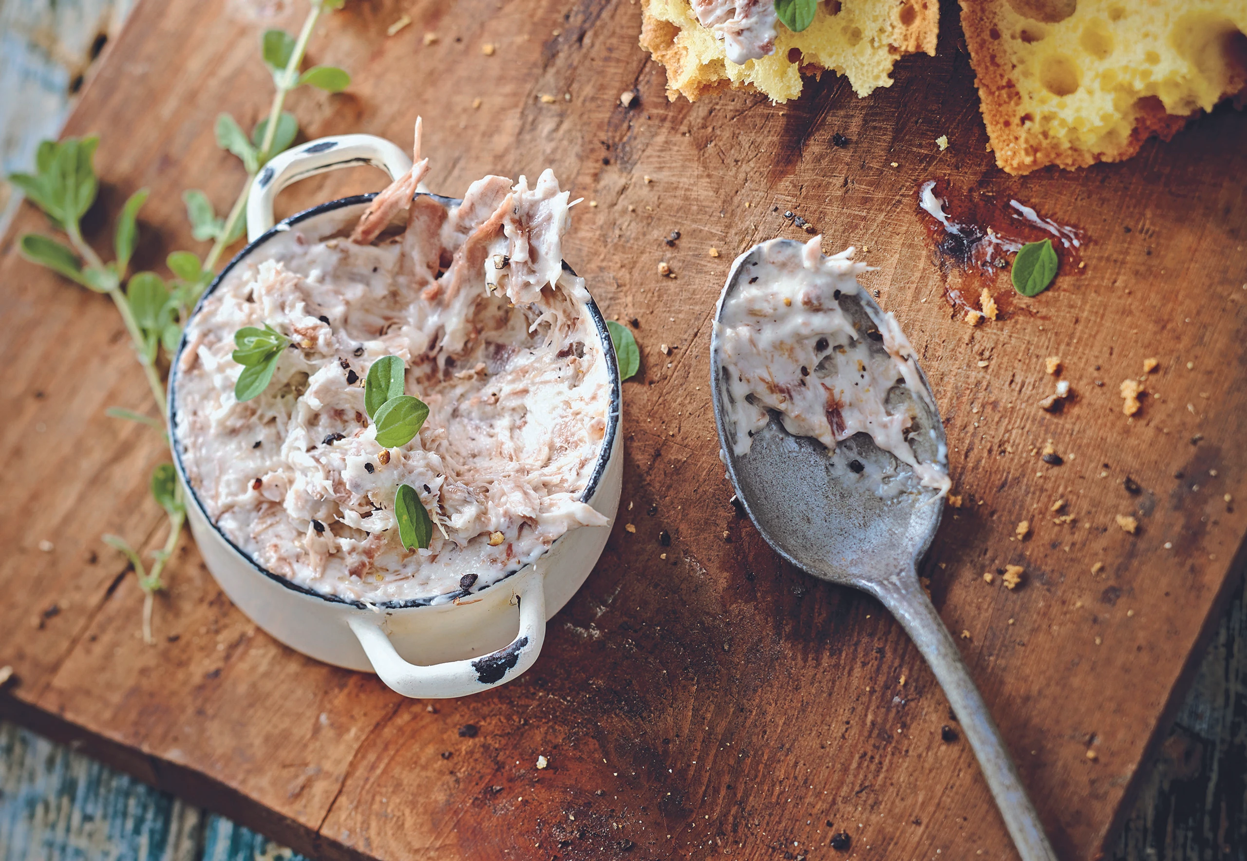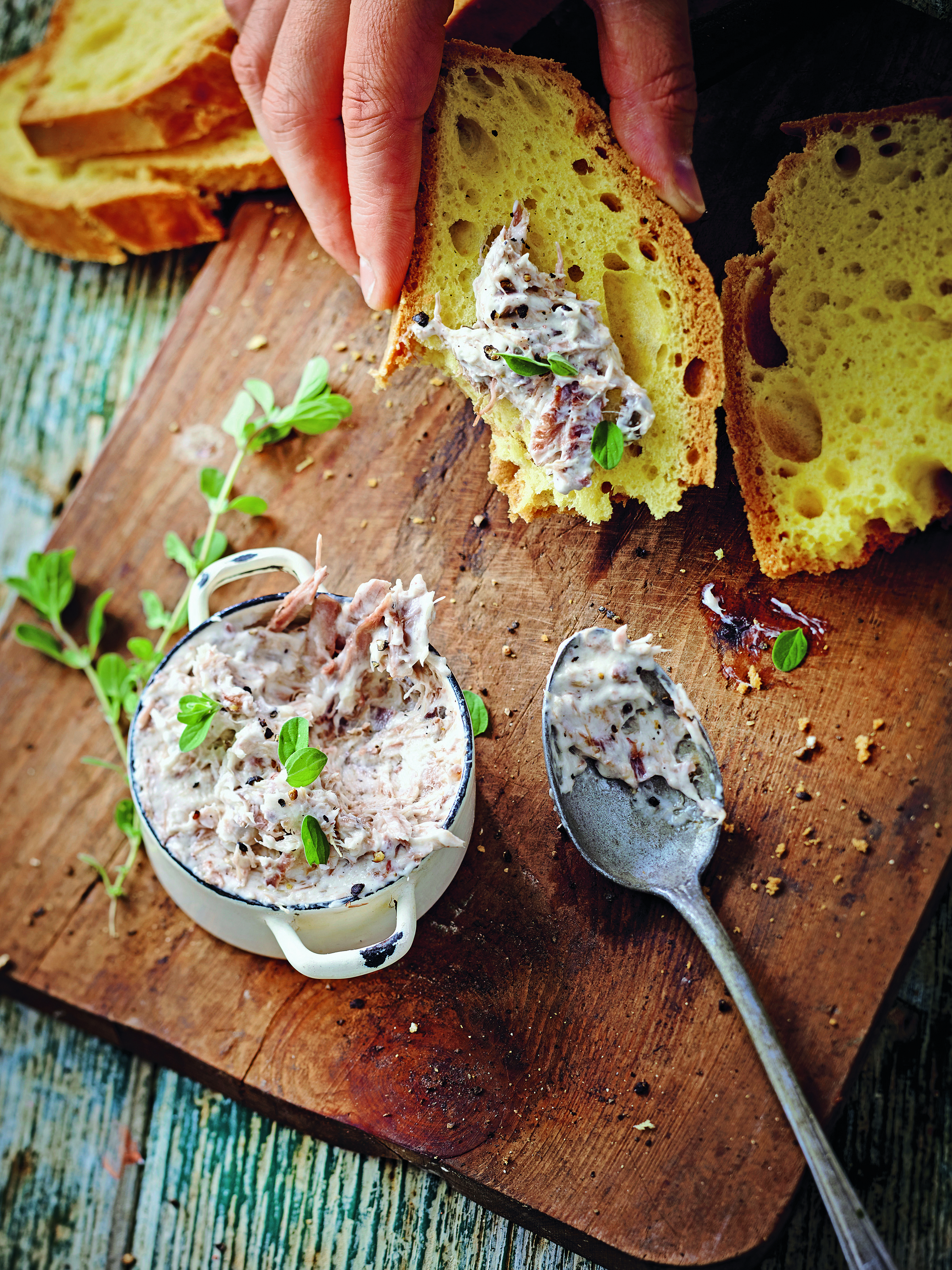 Gänseschmalz schaumig schlagen, Fleisch und zerdrückten Knoblauch untermischen. Majoran fein hacken. Schmalz mit Majoran, Salz und Pfeffer würzen.