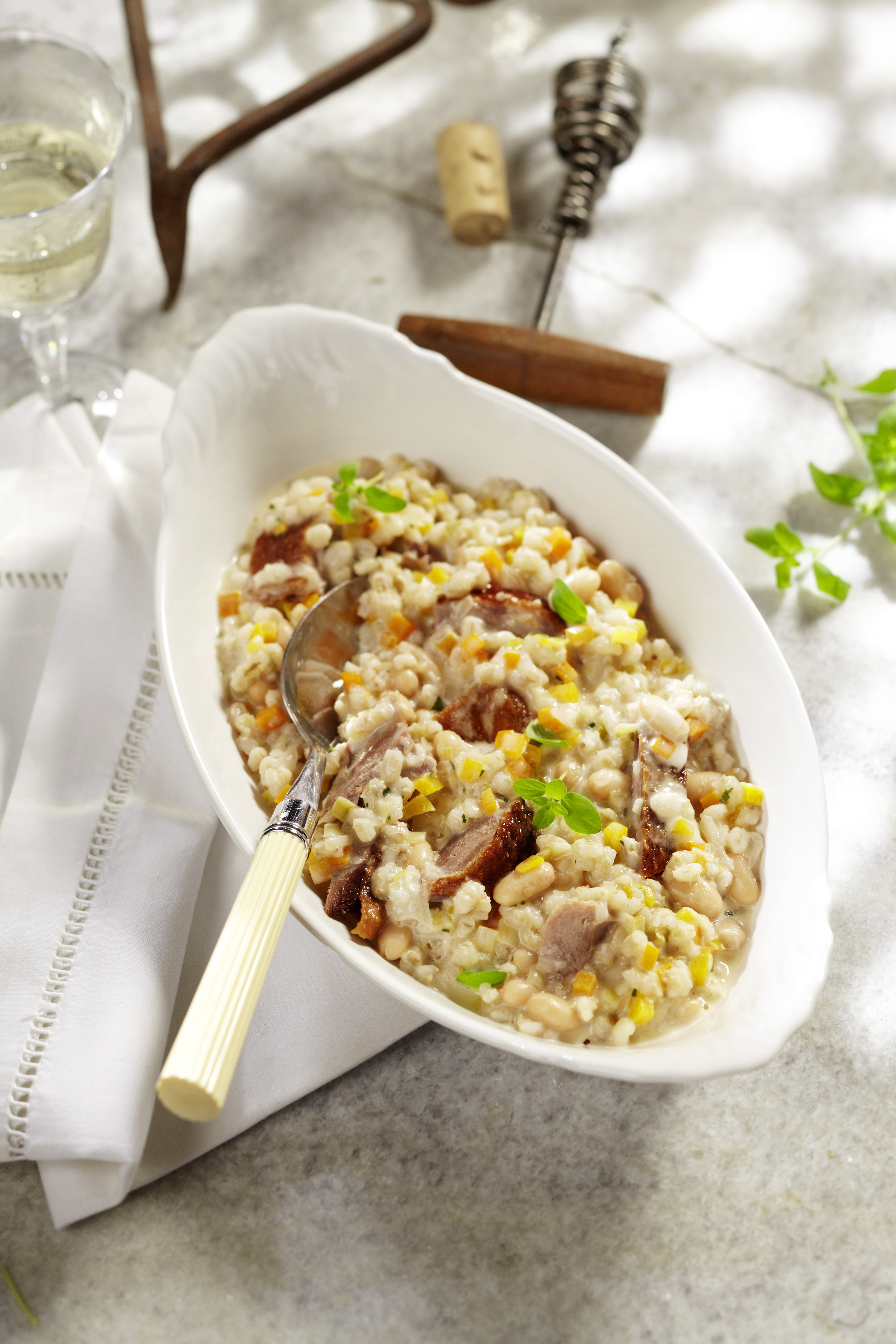 Bohnen und Rollgerste getrennt für ca. 8 Stunden in kaltem Wasser einweichen.