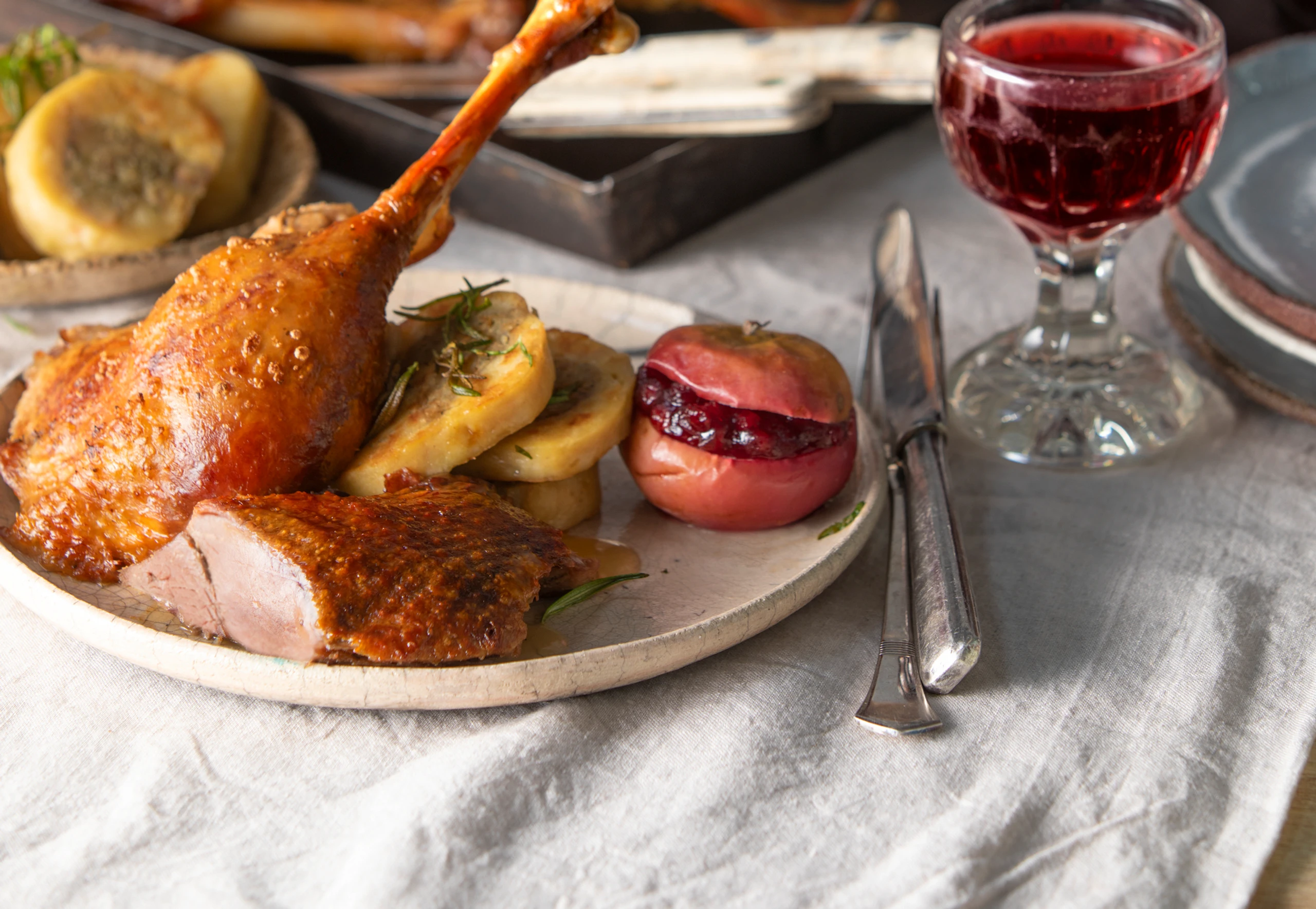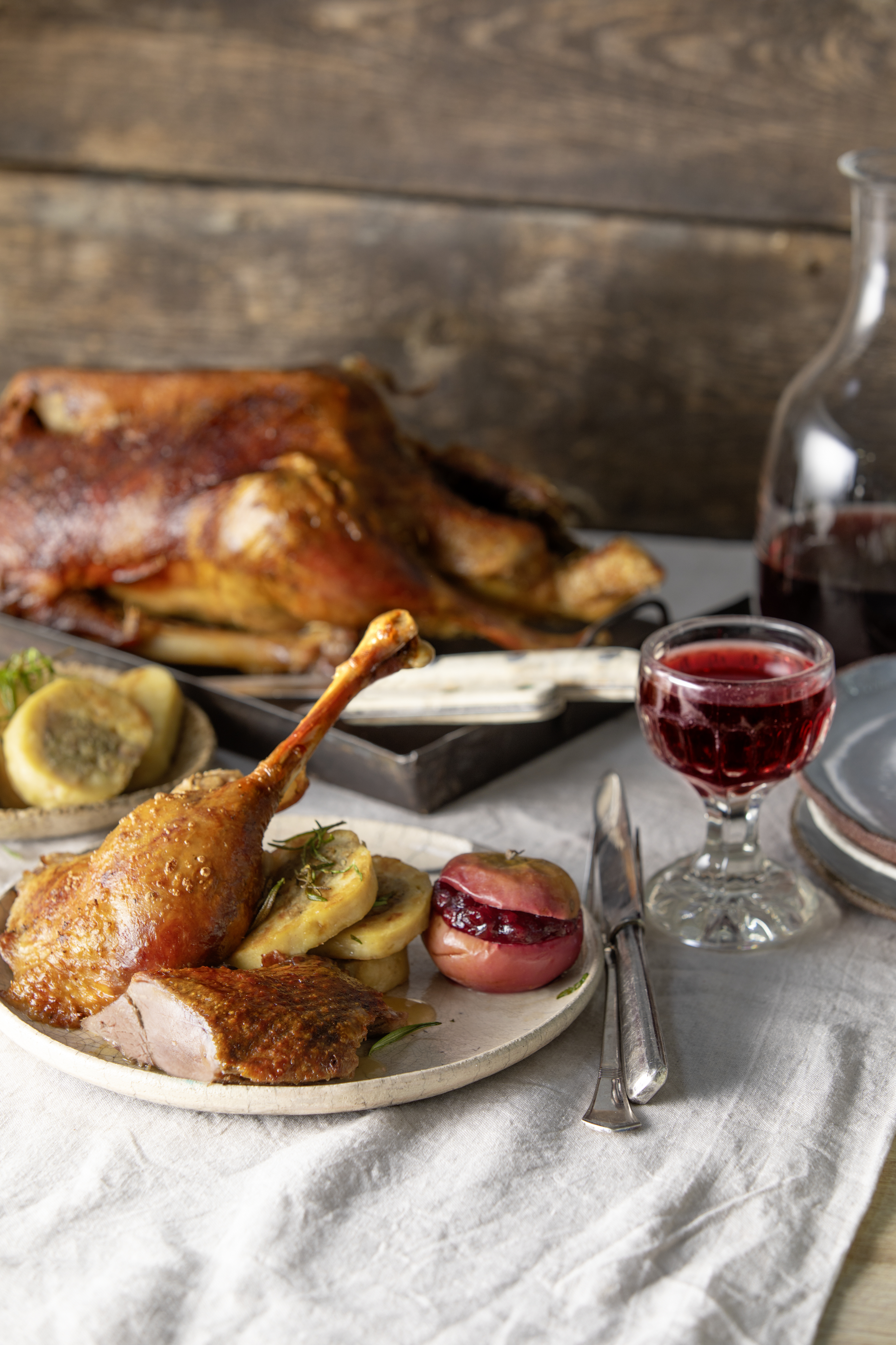 Gans herausnehmen und ca. 10 Minuten rasten lassen. Fettschicht vom Saft schöpfen. Saft und Wein in einen Topf gießen und fast zur Gänze einkochen lassen. Suppe zugießen, Sauce ca. 5 Minuten köcheln, abseihen. Gans tranchieren und mit Sauce und Beilagen anrichten.
