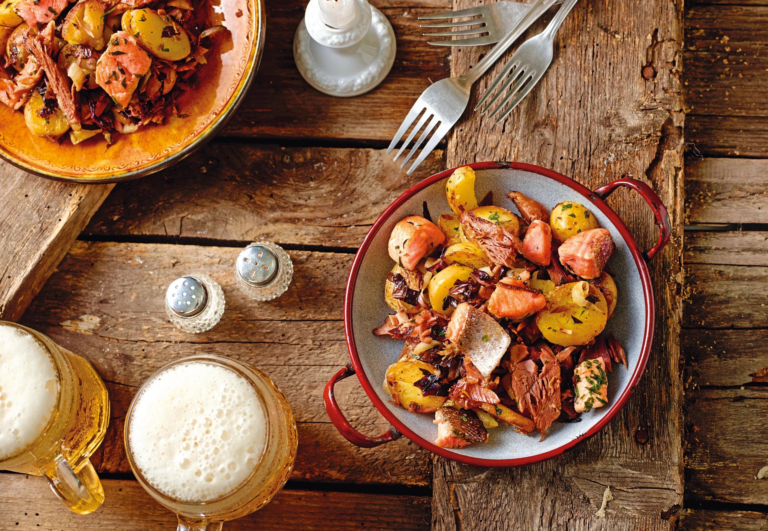 Im Bratrückstand übriges Öl erhitzen. Forellenfilets darin braten. Gröstl mit der Lachsforelle anrichten.
