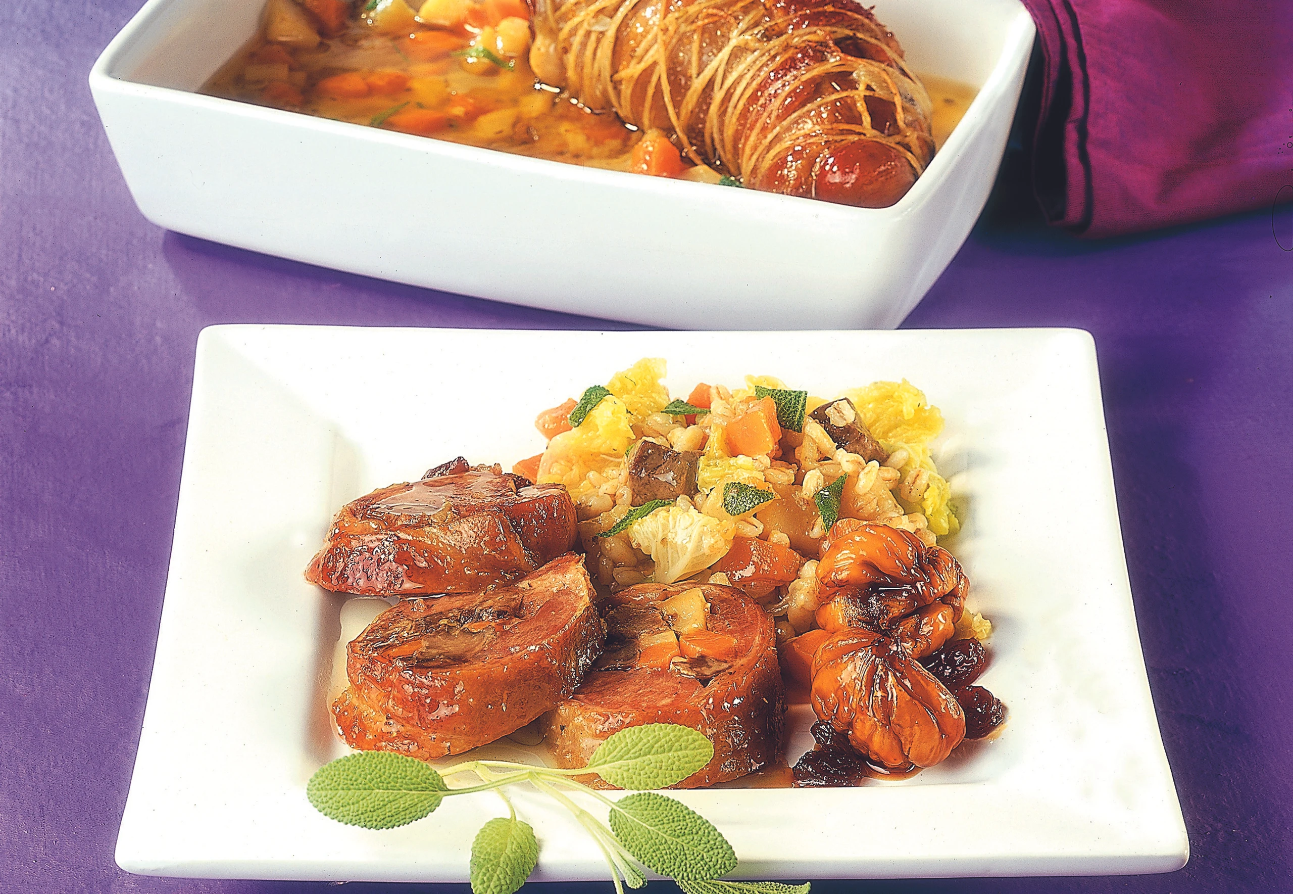 Für die Garnitur Butter und Zucker schmelzen, Maroni, Rosinen und reservierten Bratensaft untermischen.