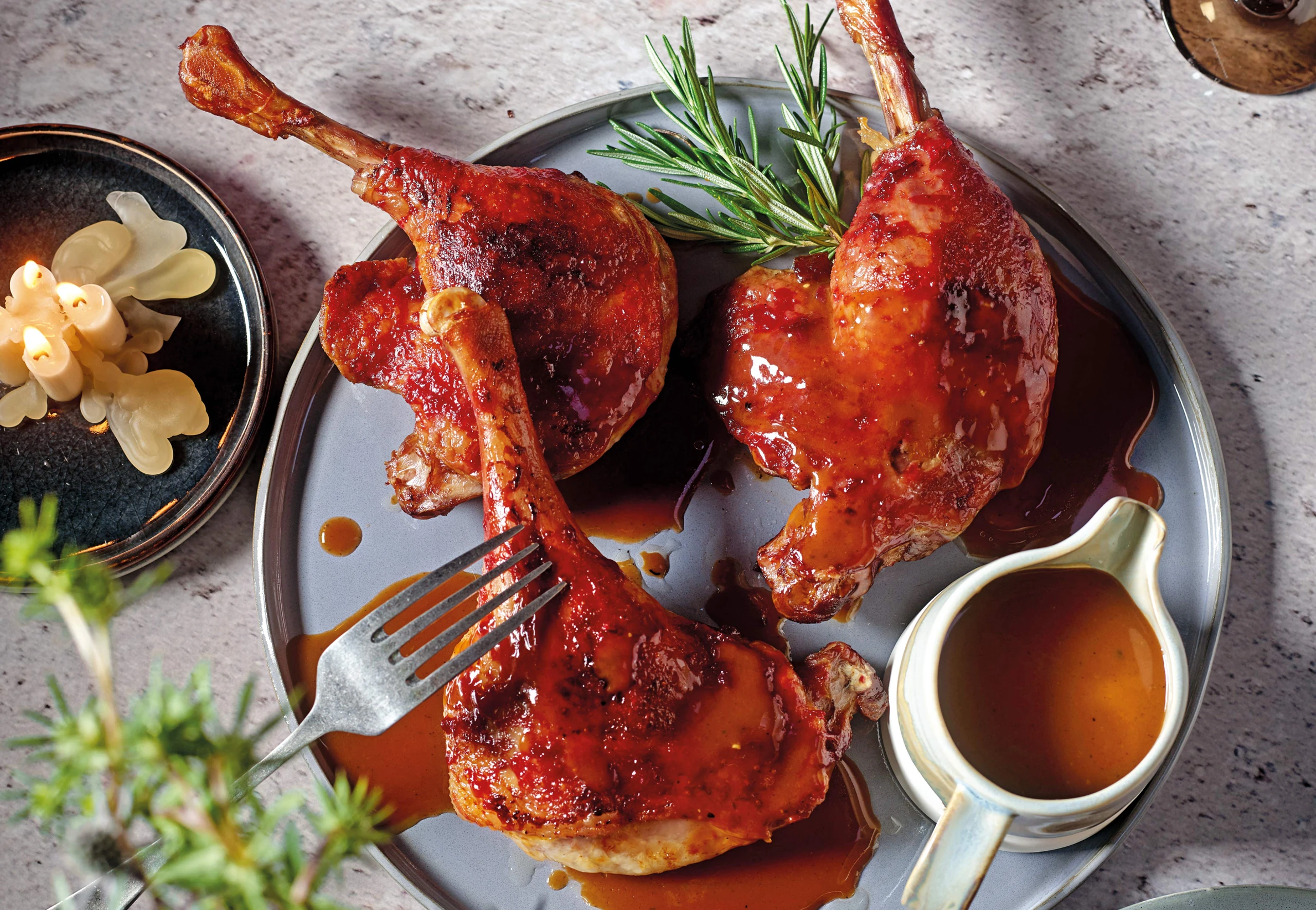 Rohr auf 220 °C Oberhitze aufheizen. Keulen auf ein Blech legen und im Rohr (2. Schiene von oben) ca. 8 Minuten grillen, bis die Haut dunkelbraun und knusprig ist. Ganslkeulen mit der Sauce servieren.