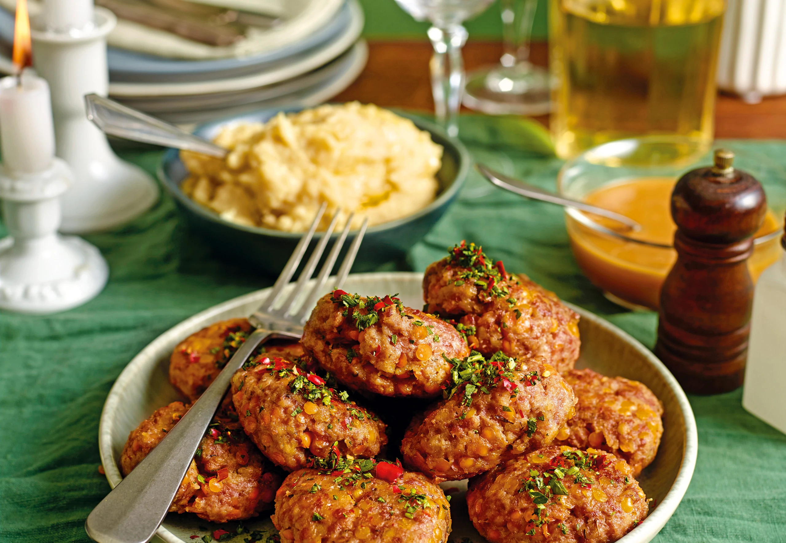 Bratensaft und Püree erwärmen. Laibchen mit Petersilie und Chilis bestreuen und mit Bratensaft und Püree servieren.