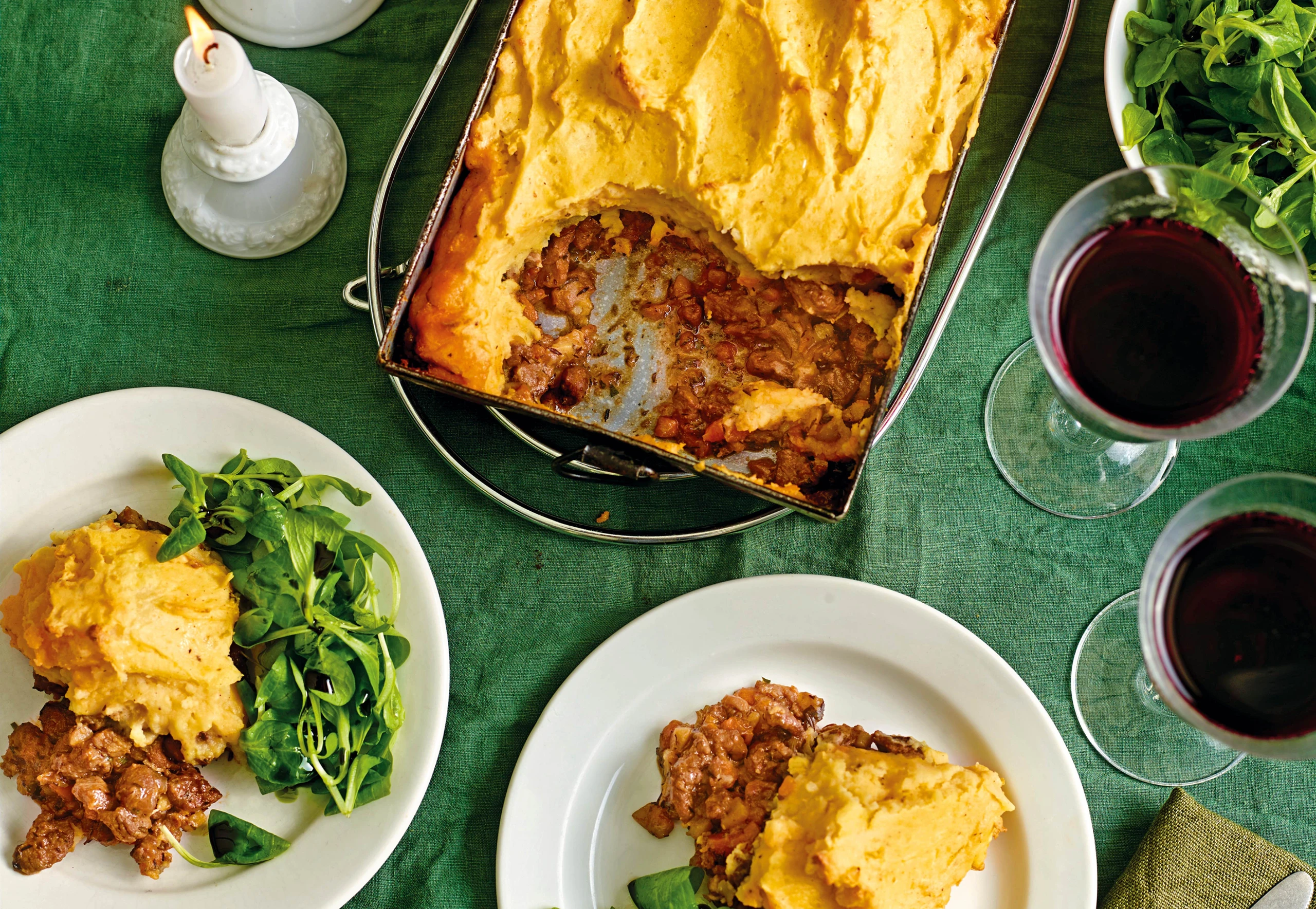 Rohr auf 200 °C vorheizen. Ragout in eine Auflaufform (ca. 15 x 25 x 5 cm) füllen, Püree gleichmäßig darauf verteilen und im Rohr (mittlere Schiene / Gitterrost) ca. 25 Minuten goldbraun backen.