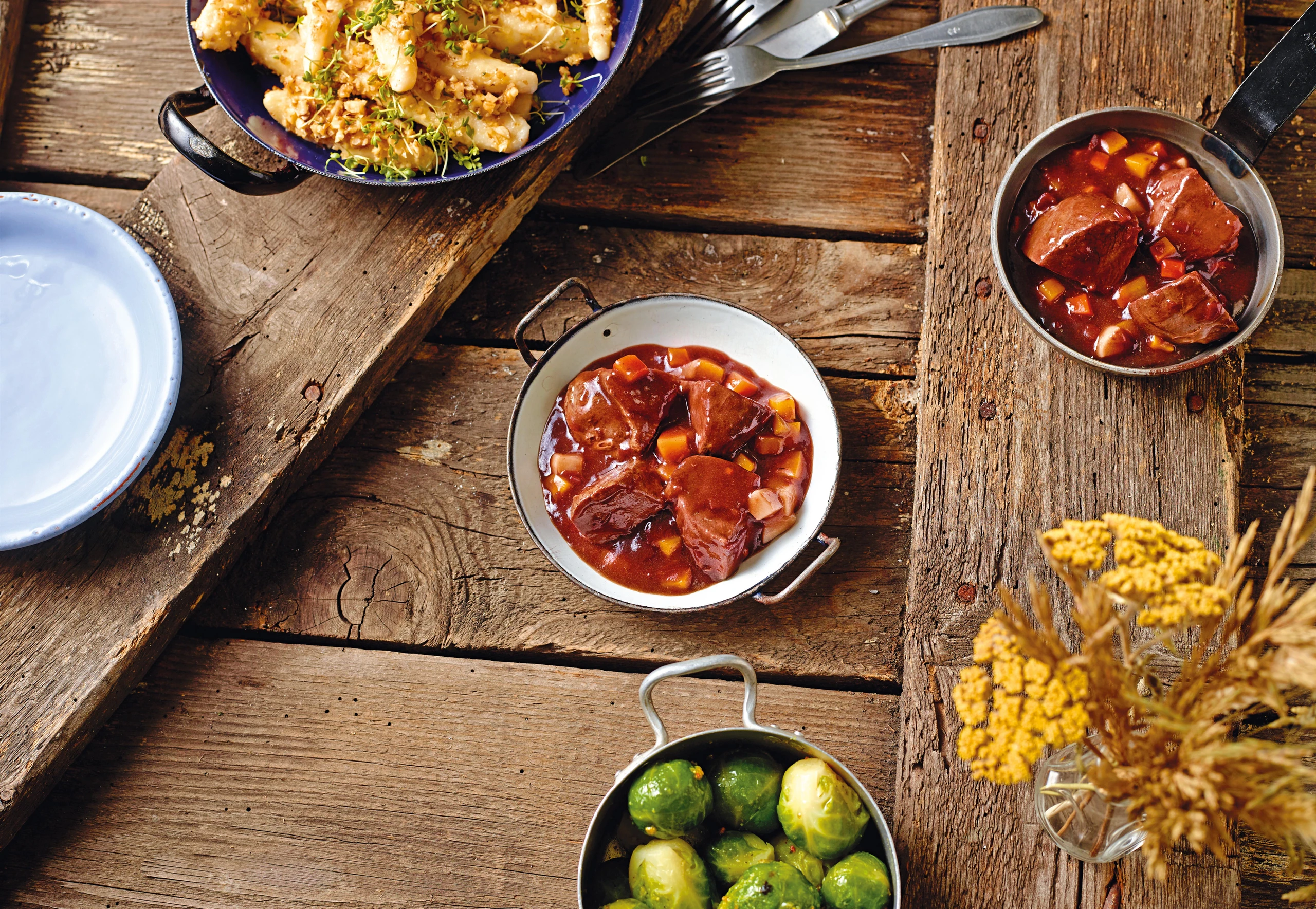 Ganslragout mit Topfen-Nussnudeln und Kohlsprossen