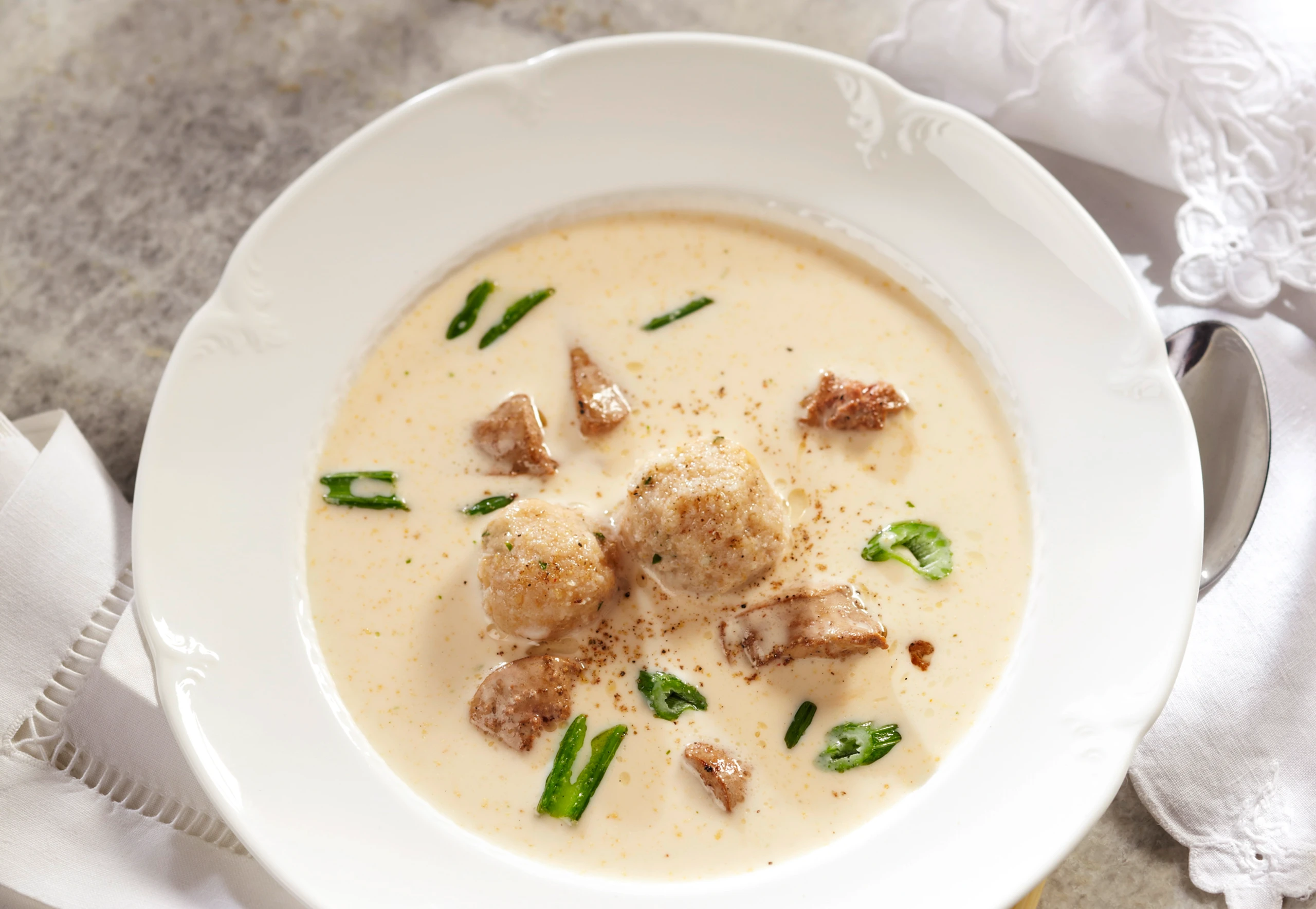 Suppe abseihen (sollte ca. 1 l ergeben, eventuell einkochen oder Wasser zugießen). Mehl in Butter anschwitzen, mit Suppe und Obers aufgießen. Suppe ca. 15 Minuten köcheln.
