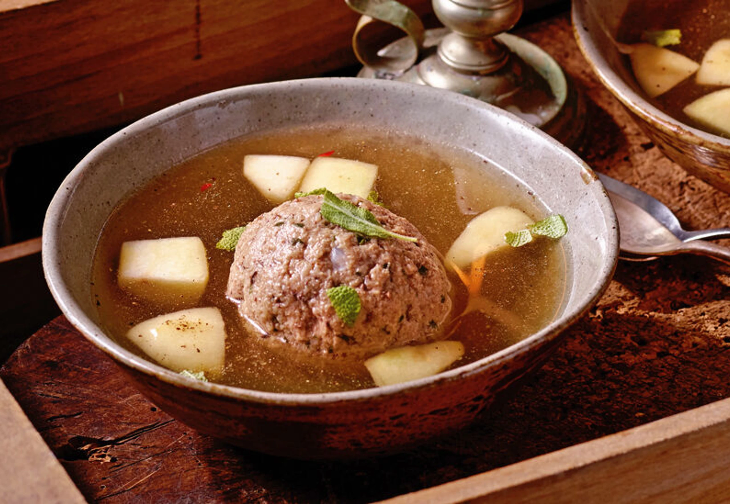 Suppe mit Knödeln und Apfelstücken anrichten und mit Salbei bestreut servieren.