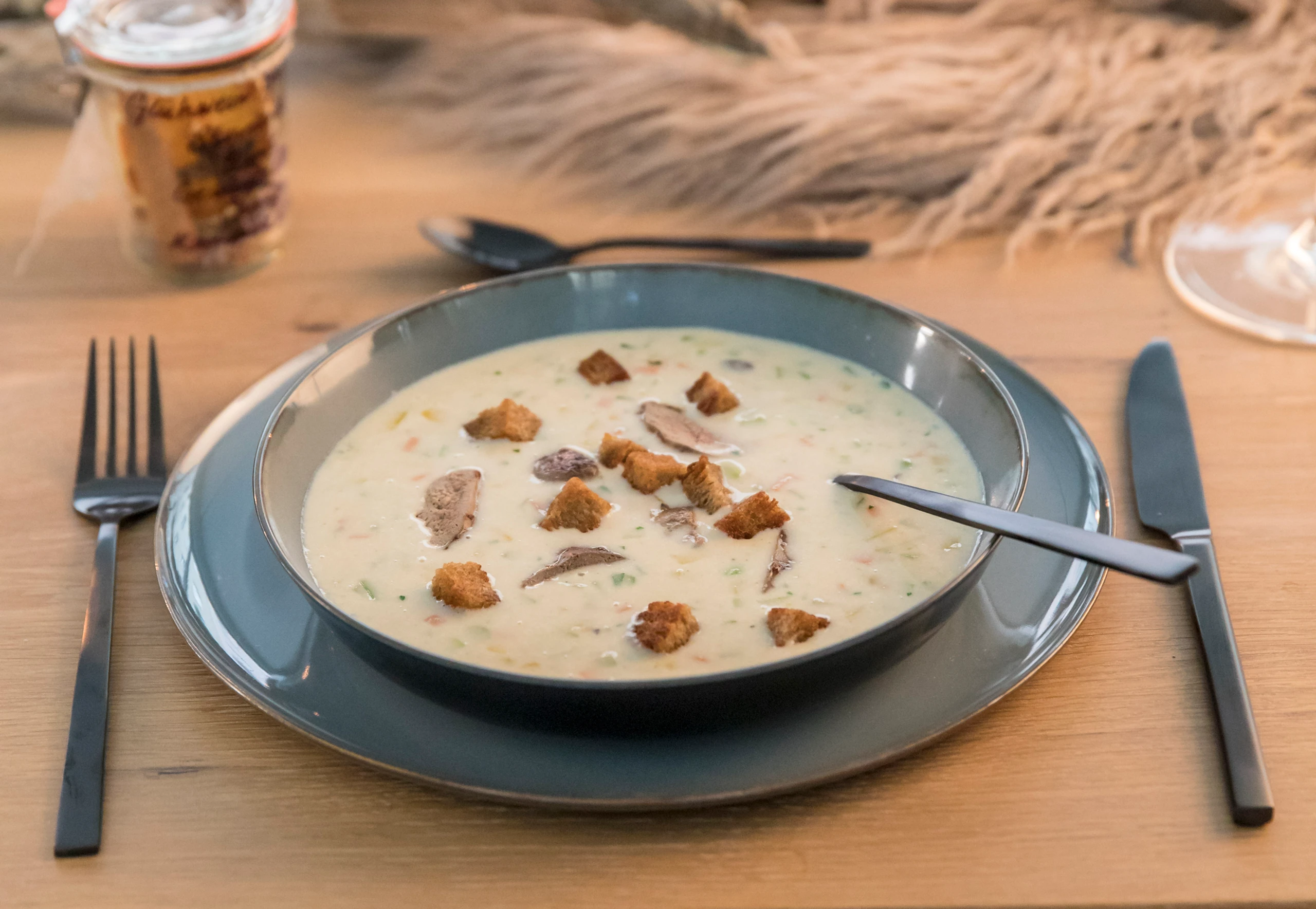 Für die Suppe Gänseklein waschen, mit 2 l leicht gesalzenem Wasser aufgießen und aufkochen. Knoblauch und Zwiebeln grob schneiden, mit 1 TL Majoran, 8 Pfefferkörnern und 2 Lorbeerblättern zur Suppe geben und ca. 1 Stunde köcheln. Suppe abseihen (sollte ca. 1 l ergeben, eventuell einkochen oder Wasser zugießen). Mehl in Butter anschwitzen, mit Suppe und Obers aufgießen. Suppe ca. 15 Minuten köcheln.